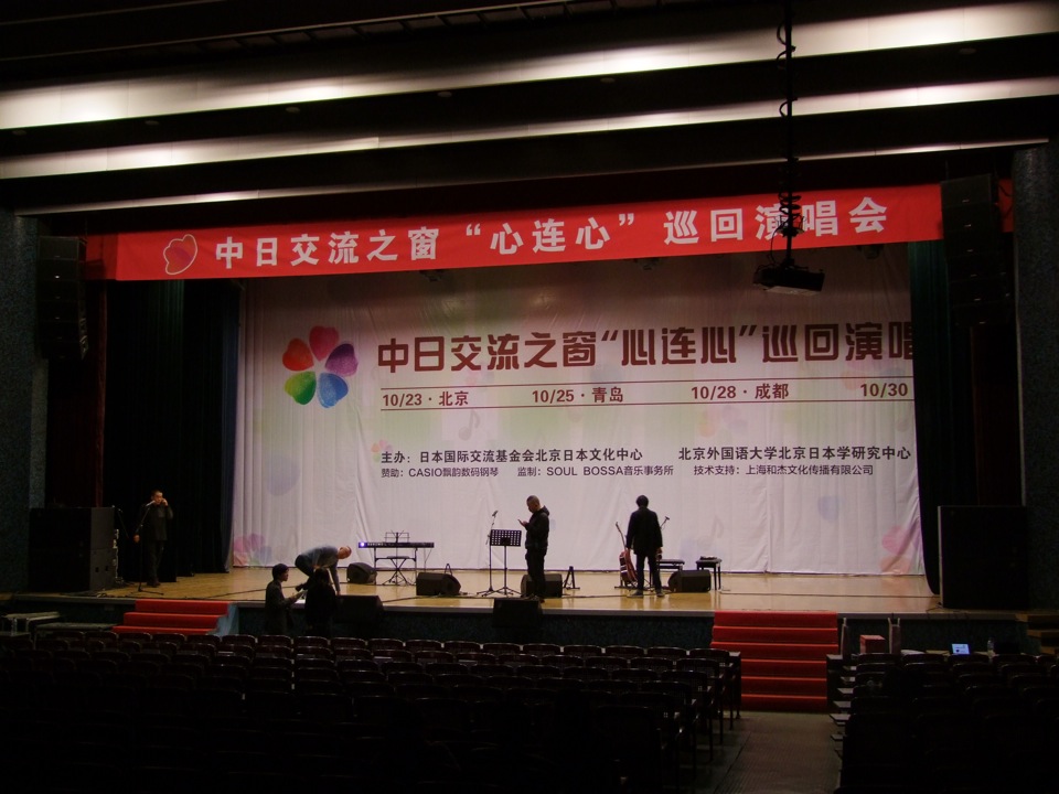 会場は右上写真の場所、北京外語大学の講堂にてでした。沢山のお客さんにお越し頂き、その過半数は外語大の生徒だったそうですが、殆どの人が日本語を理解している事には驚きました。皆さん本当に勉強熱心で、そして積極的に日本語を話していこうとする姿勢には感心するばかりでした。