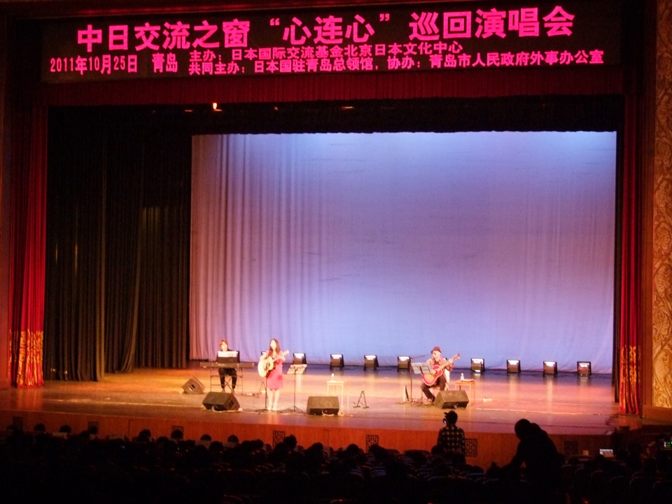 青島での会場は大きく、2階席もあって、1300名ぐらいが入る場所との事。この時のお客さんは1000人には届いていたのではないでしょうか。とにかく気持ち良く演奏させて頂きました。右上の写真の真ん中の方は、現地の司会の方です。沢山お世話になりました!