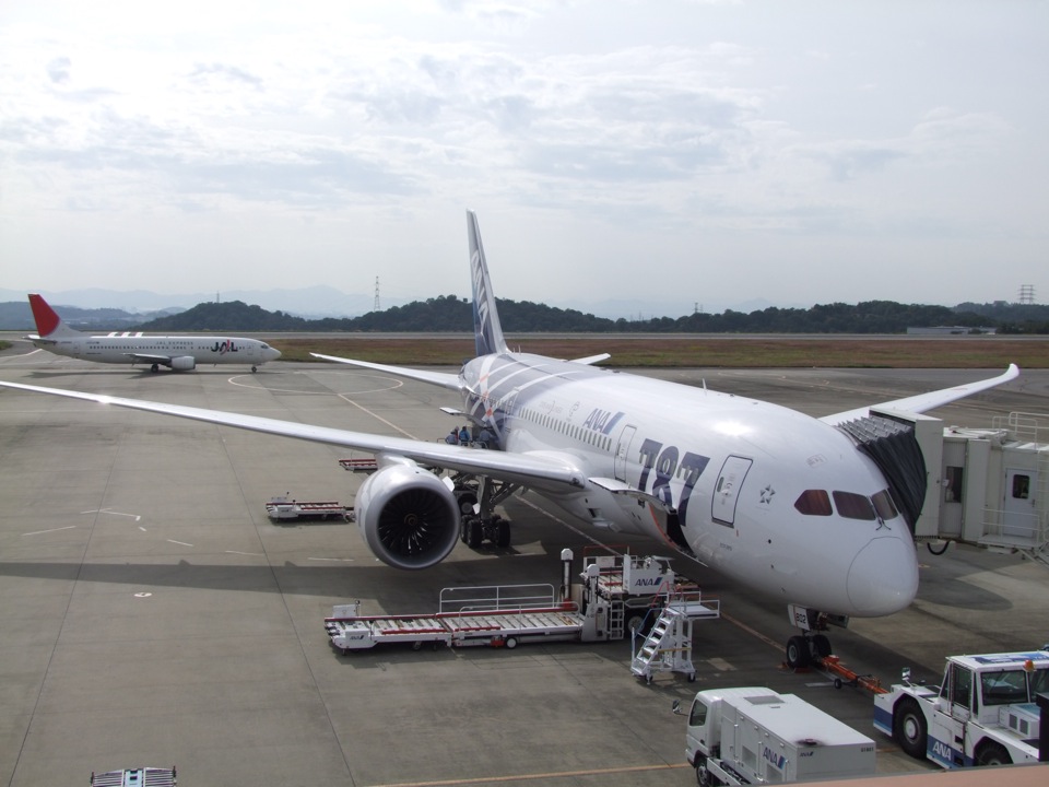 見よ、この勇士!…背後には、ライバル航空会社の日本航空が控えていますが…(笑)。見て分かるように、胴体には“787”とデカデカと描かれている等、普段の ANA とは違う特別塗装にもなっています。写真は岡山空港で、要はボーイング787の現在のスケジュールが、羽田空港から岡山空港を往復した後に、広島空港を往復する…という行程になっていて、なるべく早い便に乗りたかったので、…と、岡山に行ってしまったわけです(笑)。定期便就航2日目という日でしたが、予想通り満席でしたね。