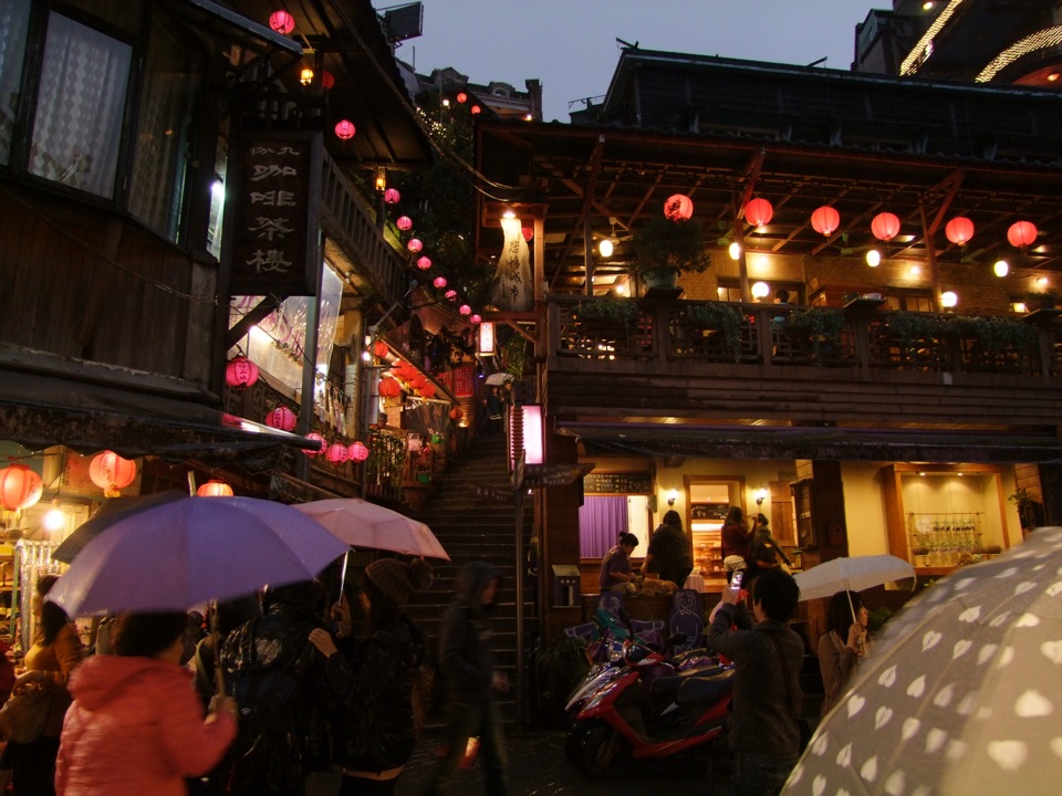 その帰りには、せっかくなので前回の台湾旅行でも訪れた九份(ジュウフン)という場所にも行ってきました。山間部に位置する、坂と階段とレトロな街並みが味わえる地域で、その光景はさながら“千と千尋の神隠し”の世界のようです。前回は夕方前に帰ってしまいましたが、今回は日が暮れてからも暫く居座っていたので、提灯等に灯りが点いた風景も楽しめました。