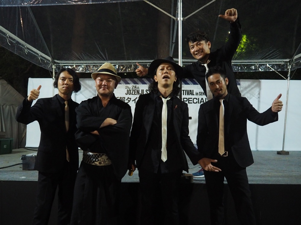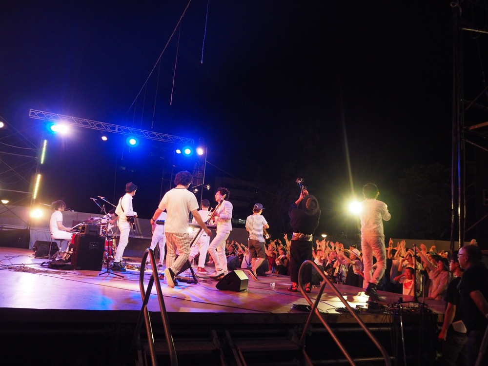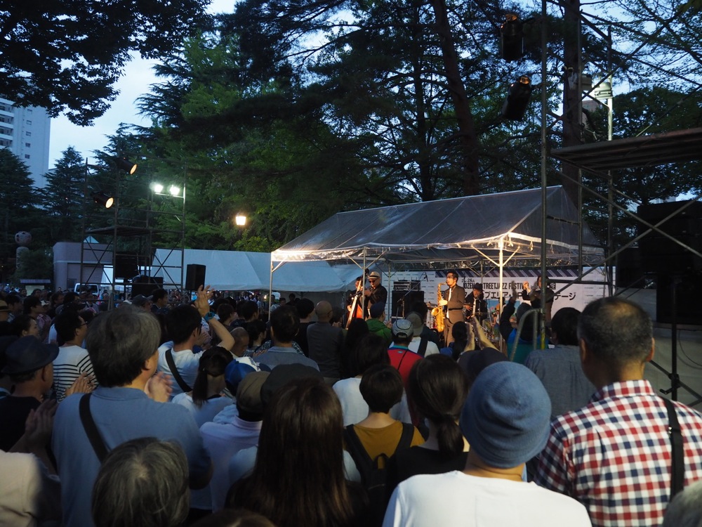 定禅寺ストリート・ジャズフェスティバルは仙台市内の、それこそ多数の場所でステージが組まれ、毎年本当に大規模に行われているのですが、自分達は東北を代表する新聞、河北新報とのタイアップ・ステージという場所にて、西公園という公園内に組まれたステージで演奏させて頂きました。周囲は屋台やテラス席が組まれていて、最初はのんびりとした風景だったのですが、ステージ時間が近付くに連れて多くの人にお越し頂き、座席も後方に移動させ、これから熱量高めのステージが始まる事を予感させそうな雰囲気にもなってきました。自分達の出番は17:35からで、陽が暮れる頃という時間帯も良かったのでしょう。徐々にライトアップの効果が高まり、フェスらしい空気に包まれた時間の中でやらせて頂いたのでした。