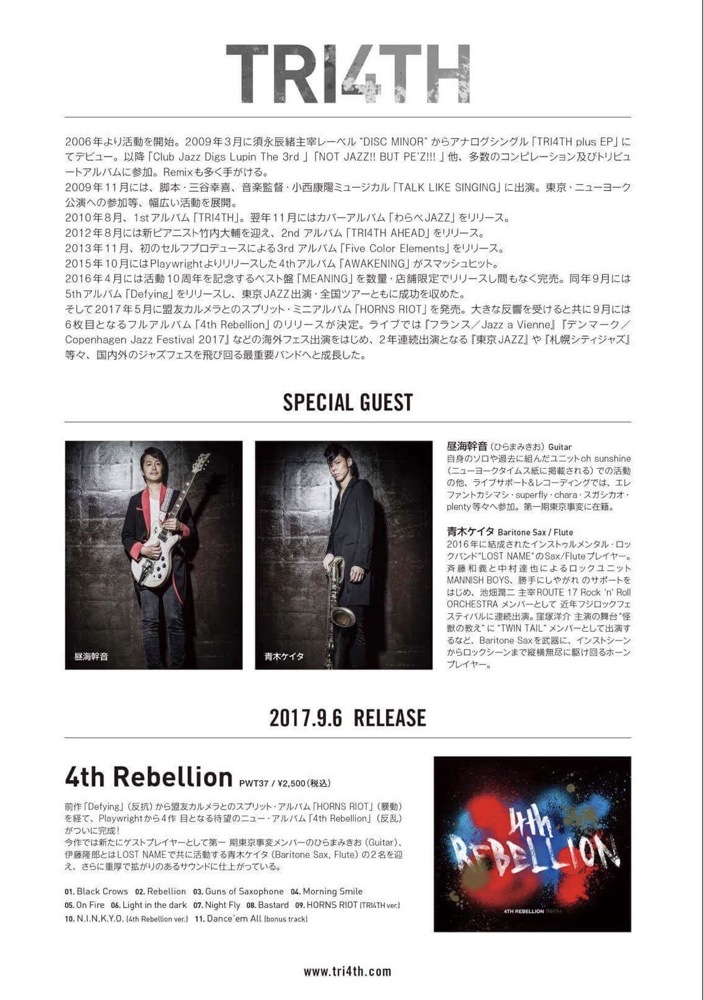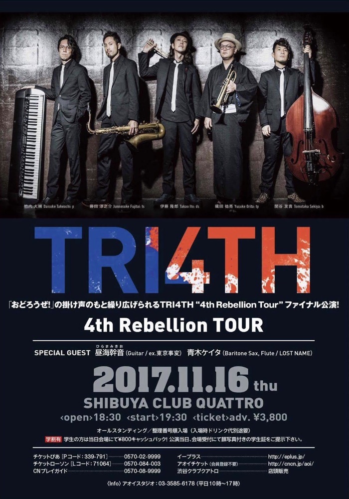 『4th Rebellion』ツアーも、いよいよファイナル、渋谷 CLUB QUATTRO での公演を残すのみとなりました。皆さん、準備は宜しいでしょうか?…TRI4TH、現在までの集大成をお見せする大事な時間です。再び、沢山のお客さんにお会い出来る事を楽しみにしております。どうぞよろしくお願いします!