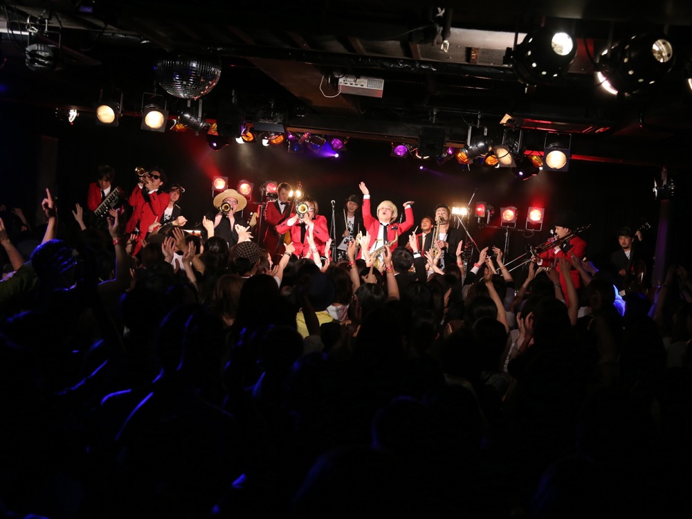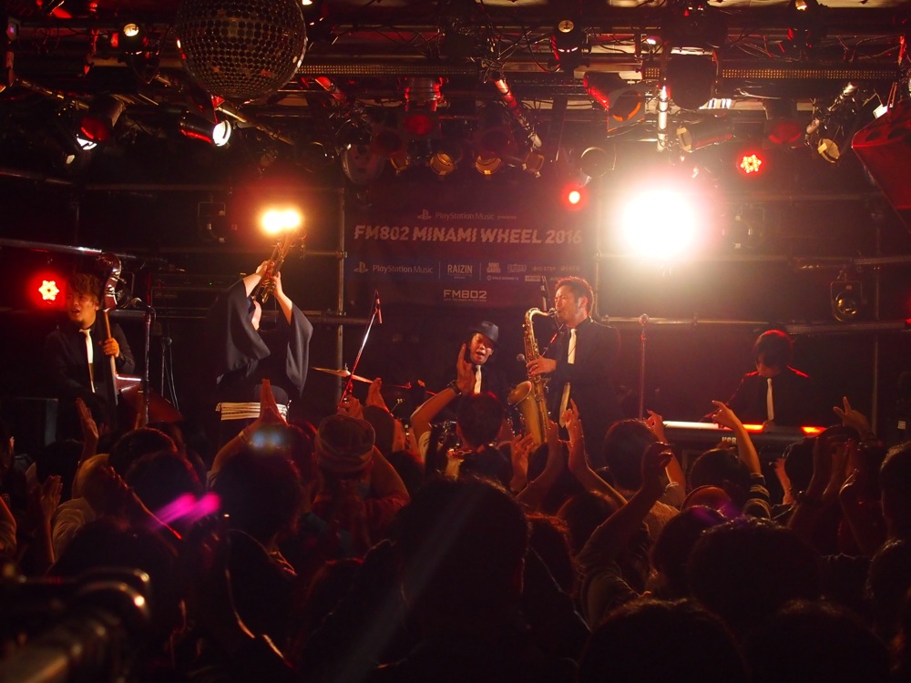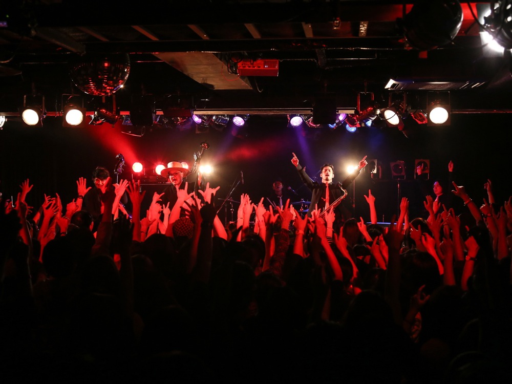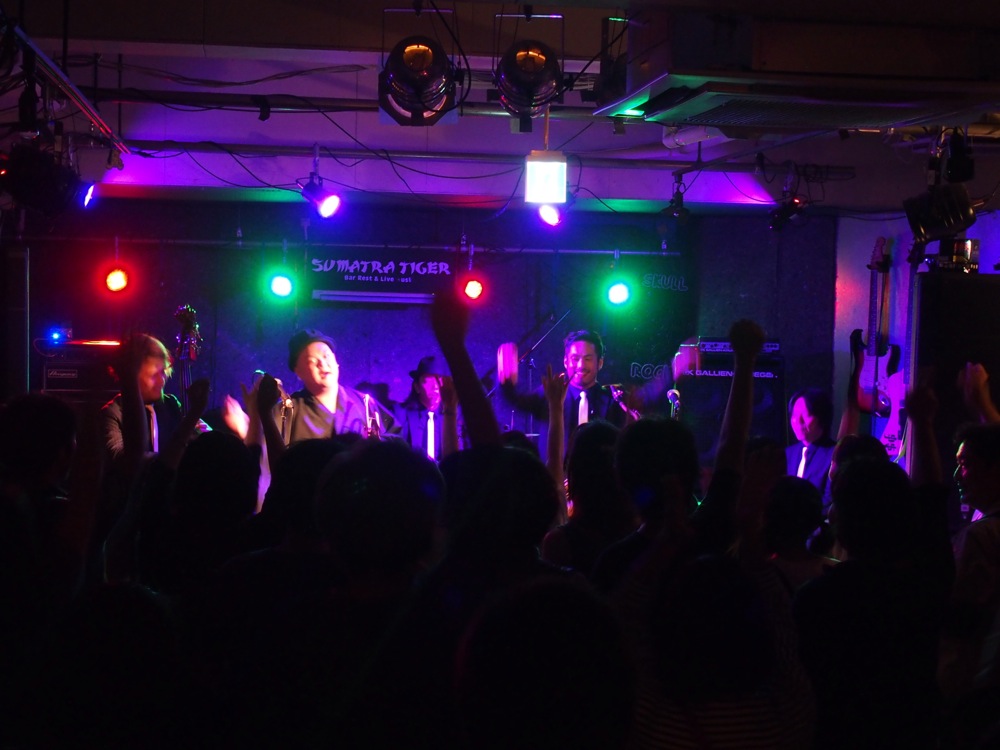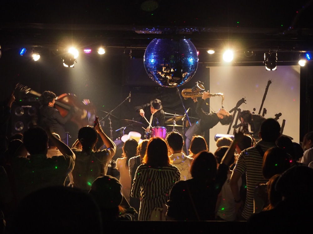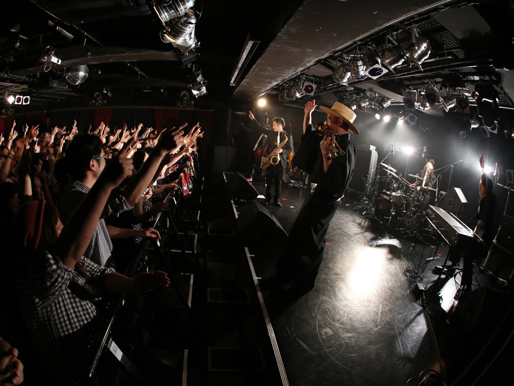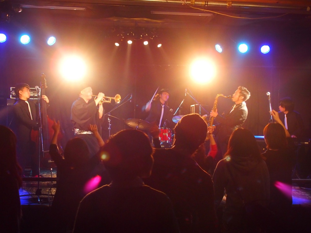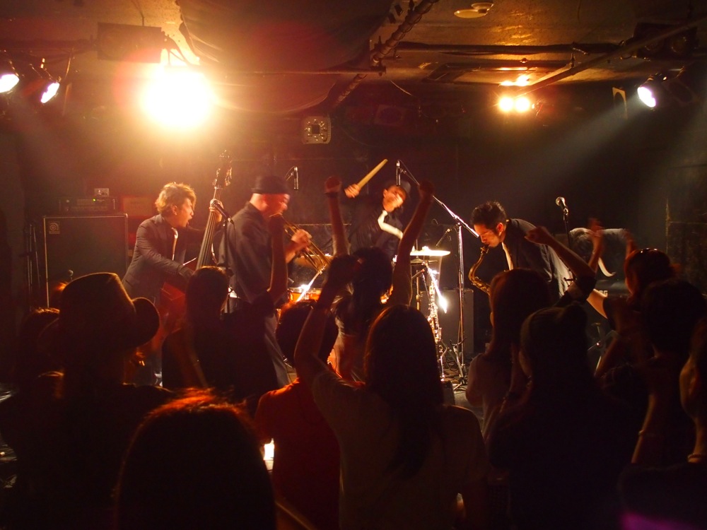 広島(左上写真参照)、福岡(右上写真参照)では、バリトンサックスの青木ケイタさんも参戦して頂き、更に暴動感溢れるサウンドをお届け出来たと思います。ケイタさんの存在感は自分達にとっても大きく、演奏は勿論、動きでもかなり触発される所があり、それが自分達の暴動感溢れるパフォーマンスの起爆剤になった事は間違いありません。各地で温かく迎えて頂けたお客さんと共に、最高に楽しい時間を過ごさせて頂きました。