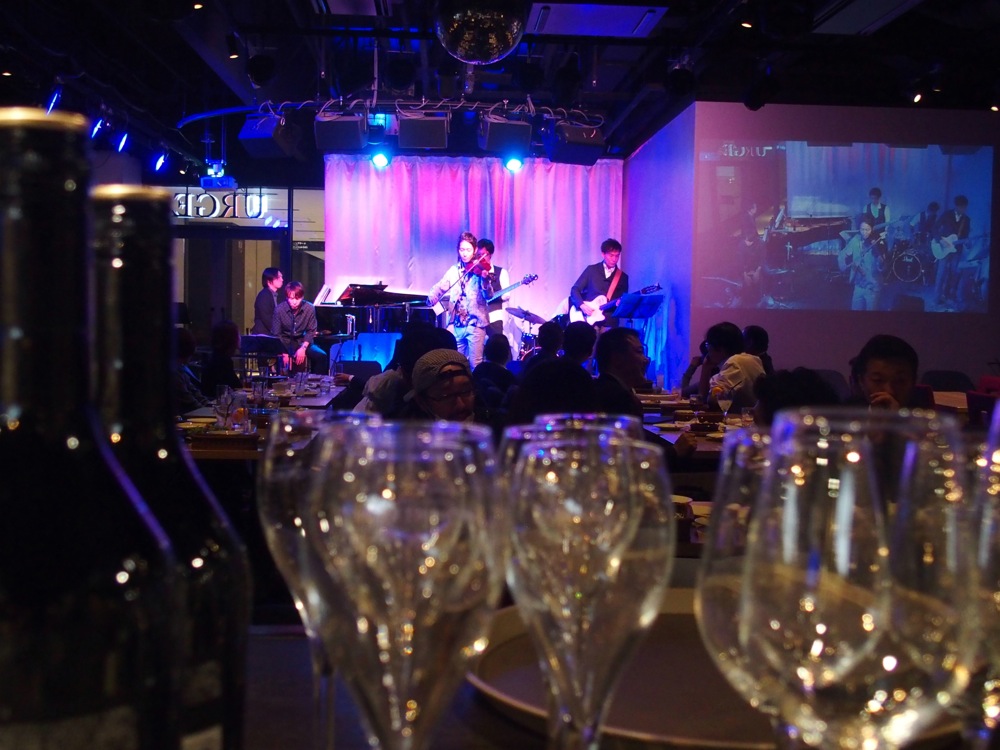 大阪 URGE はJR大阪駅直結のビルであるグランフロント大阪の北館に位置し、お店が入っている建物自体が今年の2013年に出来た比較的新しいお店です。自分も初めて訪れましたが、ここにはグランドピアノ常設のステージがあり、お店の雰囲気も相まって、Tsumuzi 君の世界観を表現するにはピッタリのお店だと思いました。店内は幾つかのスクリーンが設置されていて、最近完成した新PVも流す事が出来た等、お店のポテンシャルを余す事無く使用出来たライブでもありました。