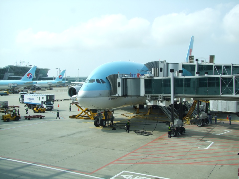 今回、ソウルへの足となる航空会社は、最初から大韓航空と決めてました。言わずと知れた、韓国の昔からある航空会社で、便数も多く、現在ではサービスも世界最高水準になりつつある、人気の航空会社でもあります。そしてこの航空会社を選んだ最大の理由として、今年の6月から運航を始めた、全2階建ての旅客機、エアバスA380-800(以下A380)の存在は無視出来ませんでした。