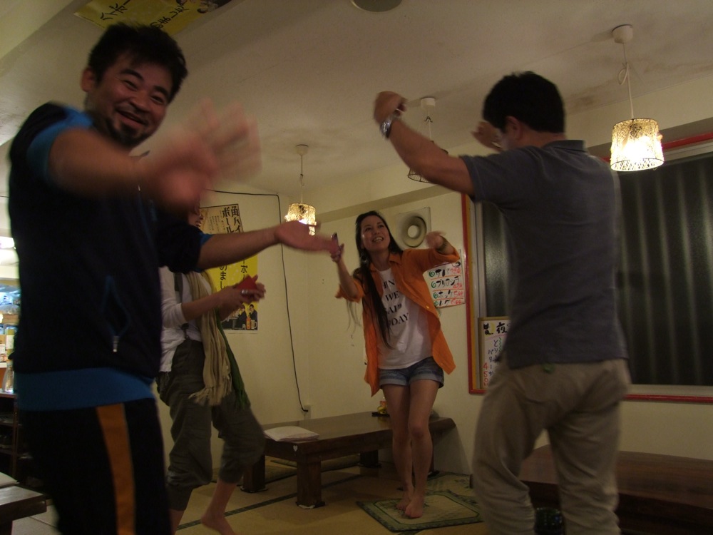 2回目となったこの時は、やはり北谷と那覇の2ヶ所でライブを行いました。どちらもお馴染み感が溢れる雰囲気の中で演奏出来たのも、自分達の成長の証だとは思うのですが、この時既に西仲さんの2作目のCDについて動き出していた頃でもあり、曲を“作品として”完成に近付けていく、大事な時期でもあったように思います。ちなみに、4月の前半では西仲さんが東京に来て何日かライブを行いましたから、4月はライブ続きな1ヶ月でもあったのですね。不思議な出会いもあり、川満しぇんしぇ~のお店、寿味食堂(右上写真参照)で、沖縄の人達がこんな状態になっていたのを忘れられません(笑)。