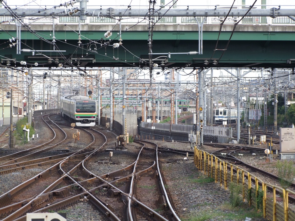 大宮駅から北側を望むと、一番東側に東武野田線があり、そしてその左側に、東北本線に挟まれる形で、高崎線の線路が伸びていくのが分かります。東北本線の下り線が、高崎線の上下線を乗り越える形となっていて、分かれた後は東北本線が右に逸れていく事からも、後から建設されたのが東北本線なのだと窺えるというものです。