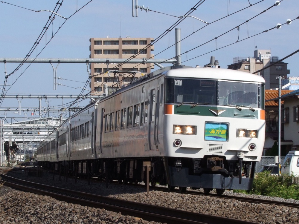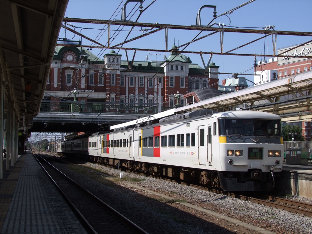 そんな185系“草津”号ですが、昨年、「特急“草津”号50周年感謝キャンペーン」を迎え、1編成だけ湘南色に塗り直されました(左上写真参照)。往年の80系を思わせる…事になっているらしいですが、個人的にはどうも違和感が漂っているように(特に正面部)見えてしまいますね(笑)。昨今は、旧国鉄塗装が流行ってはいますが、実際にこの185系が湘南色で活躍した経歴はなく、ちょっと無理がある設定のようにも思えました。