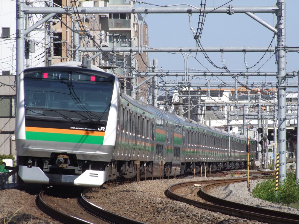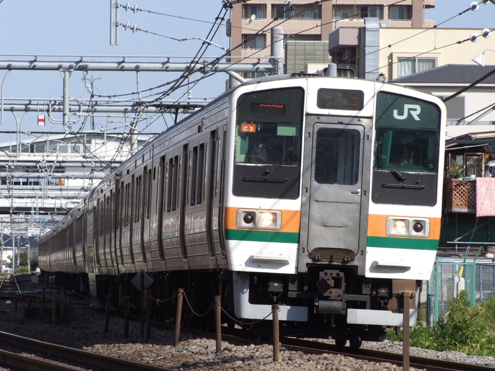 ここで、高崎線を走る普通列車の車両を紹介しましょう。まずは、高崎線の主力…と言うか、今やJR東日本の関東圏の主力車両と言っても良いE231系です。その使用線区はJR山手線を初め、JR総武緩行線、JR常磐線、JR東海道本線と非常に多く、特に湘南新宿ラインの普通列車は、全てこの車両が使用されています。登場当初は、近郊型ながら4扉車両というのが波紋を呼び、通勤型とほぼ変わらなく、旅情が無くなったとの批評も受けていましたが、この車両のお陰で混雑度はだいぶ緩和されたとも言えるのです。4扉車ながら、セミクロスシート車両も連結されているのが特徴で、高崎線、東北本線で使われている小山車両センターの車両は、基本編成の10両編成が1、2号車、付属の5両編成を繋げた15両編成では、更に14、15号車がセミクロスシート車となります。