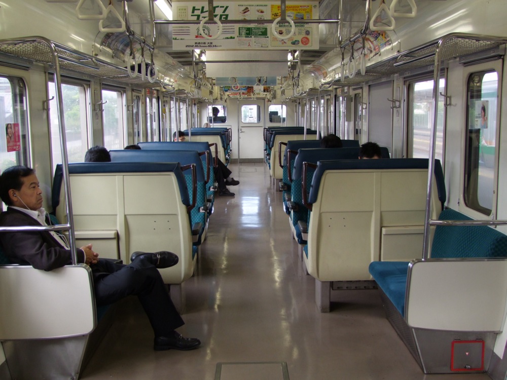 では、そろそろ先へと進みましょう!…この先は列車の本数もグッと減って、1時間に3本程度の運転となります。また、昨年から節電対策として、この先の区間は電車のドアの開け閉めが半自動(押しボタン式)になりました。