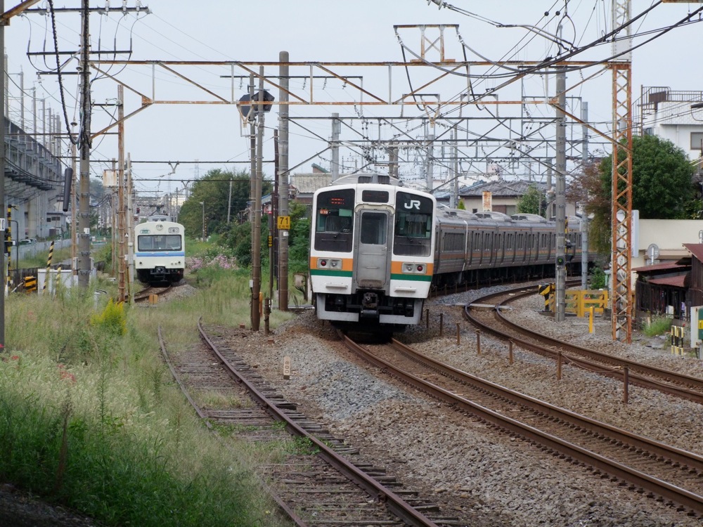 …神保原駅を過ぎ、新町駅を過ぎると、左からJR八高線の線路が近付いてきて、向こうには北藤岡駅という駅が見えますが、高崎線側には駅はありません。そのまま線路は合流して、まるで高崎線の一部になったように路線は進んでいき、烏側を渡ると倉賀野駅です。ここが事実上、八高線との分岐駅になりますが、実際に合流するポイントからは3km以上は離れており、何だか不思議な感じはしますね。また、八高線の列車は、全て次の高崎駅まで直通しています。