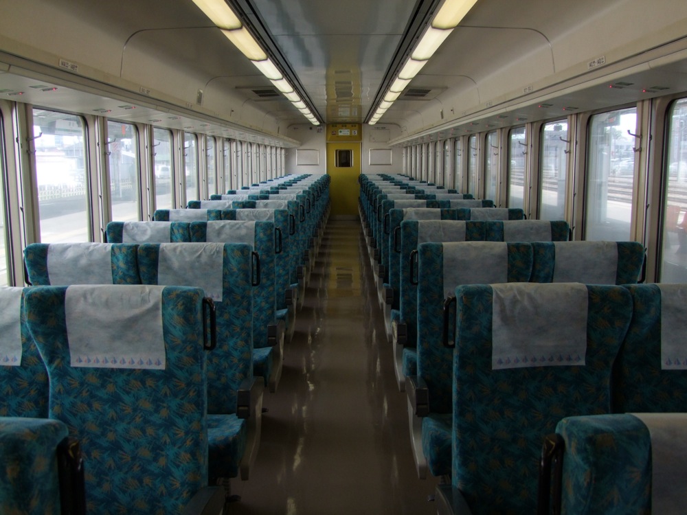 宇土駅を出ると、南向きだった路線を西向きへと変え、宇土半島へと向かっていきます。三角線を走る車両はキハ31形(右下写真参照…車内は右上写真参照)を中心としていて、2両編成で走る時には、キハ40形を連結していたりします。国鉄末期に登場した、少々コストダウンを図った車両でもありますが、座席は新幹線0系の廃車発生品の転換クロスシートを装備してたりするので、観光的には悪くない車両でもあります。