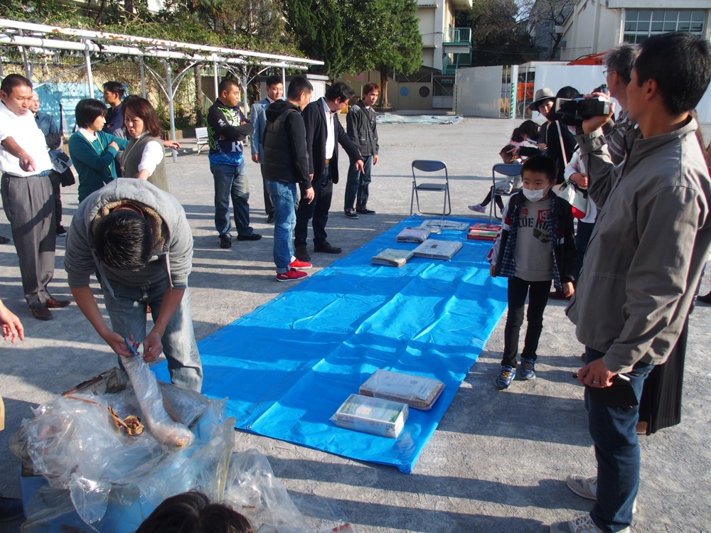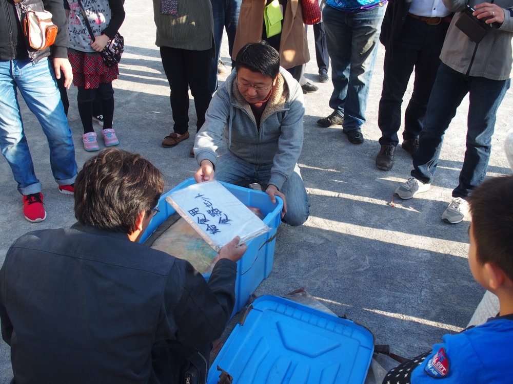恐らく、当時6年生だった生徒が書いたものでしょう。書いた本人がここに居たら面白かったのですが、それは適わず、代表者の方に読み上げて頂きました。30年後の未来なんて想像がつかず、校舎も校庭も変わっているかもしれません…という内容もありましたが、その予想を覆すように見事に変わっていない校舎の前で読み上げられたのもまた一興。…そして、いよいよ収納ボックスの中のものを出す作業に入ったのでした。