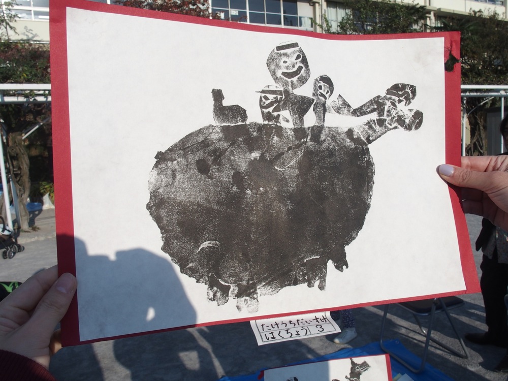 中には、当時の給食の配膳食器、体操着(名前入り…笑)、帽子、上履き、教科書、その他に理科や算数等で使う道具箱等、学校や授業で使われていたものが最初に入っていて、それを校庭に敷かれたブルーシートに置いていく様は、どこか事件性を匂わせるような光景になっていましたが(笑)、それらに交じって、クラス毎に作った作品を収めた封筒が入っていました。当時、1年3組だった自分達の作品は、“作文”と“版画”で、版画には「動物にのって」というテーマも添えられていました。これを見ても、自分が何をしたのか全然思い出せませんでしたが、いよいよ自分の作品と対面する事になるのです。…こちらです。