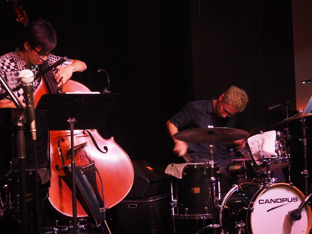 ライブ前にビールで乾杯をし、本番へと臨みます。まずは自分のオリジナル曲“Scramble”で、メンバーの今回のステージに対する出方?を確かめ合うといったような感じだったでしょうか。即興性も求められ、瞬発性も求められる曲でありますが、今までに何度も何度もメンバーで合わせてきた曲なので、ある程度の出方は分かります。その相互作用?から敢えて外してくる方向でくるのか、それともフレーズをキープさせてくるのか…等、色々と頭を働かせつつ、目の前で行われている音楽の会話を楽しむのです。2曲目には久し振りの“The Day Of The Black Key”。1st CDアルバムに収録されているだけに、トリオの初期の頃を思い出させてくれる曲です。