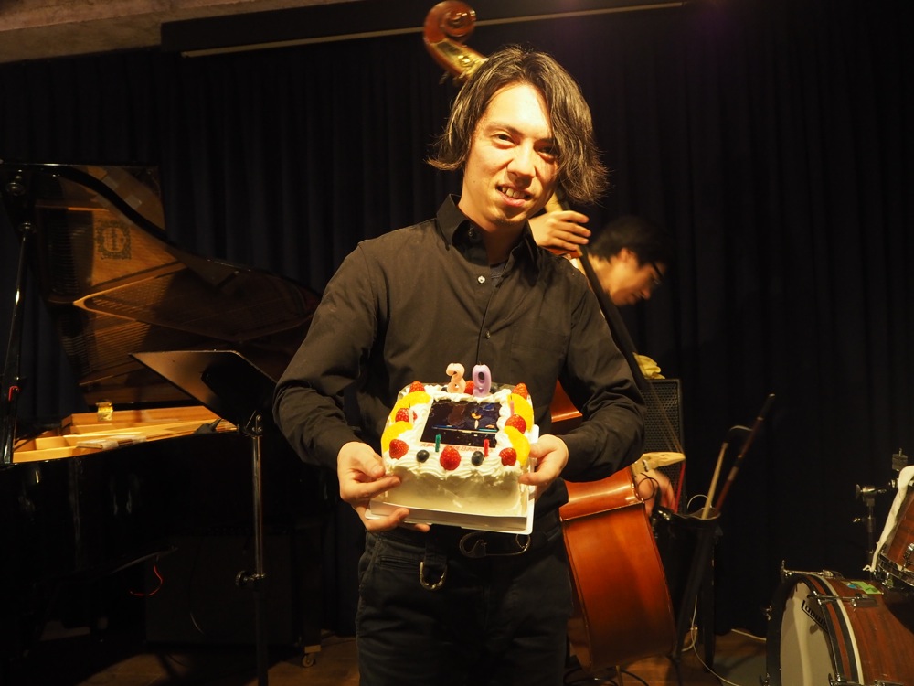 こうしてアンコールまで、約2時間半のステージを終えたのですが、演奏が終わって客席でCDのサイン等をしていると、突然、自分以外のメンバーで“Happy Birthday”を演奏し始めるではありませんか。そして自分の手元にバースデー・ケーキが…。なんと、いつの間にお客さん側から用意をして頂いたそうです。せっかくなので自分も演奏に加担し、その後ロウソクの火を消しにいきました(笑)。驚きましたが…嬉しかったです。どうもありがとうございました!