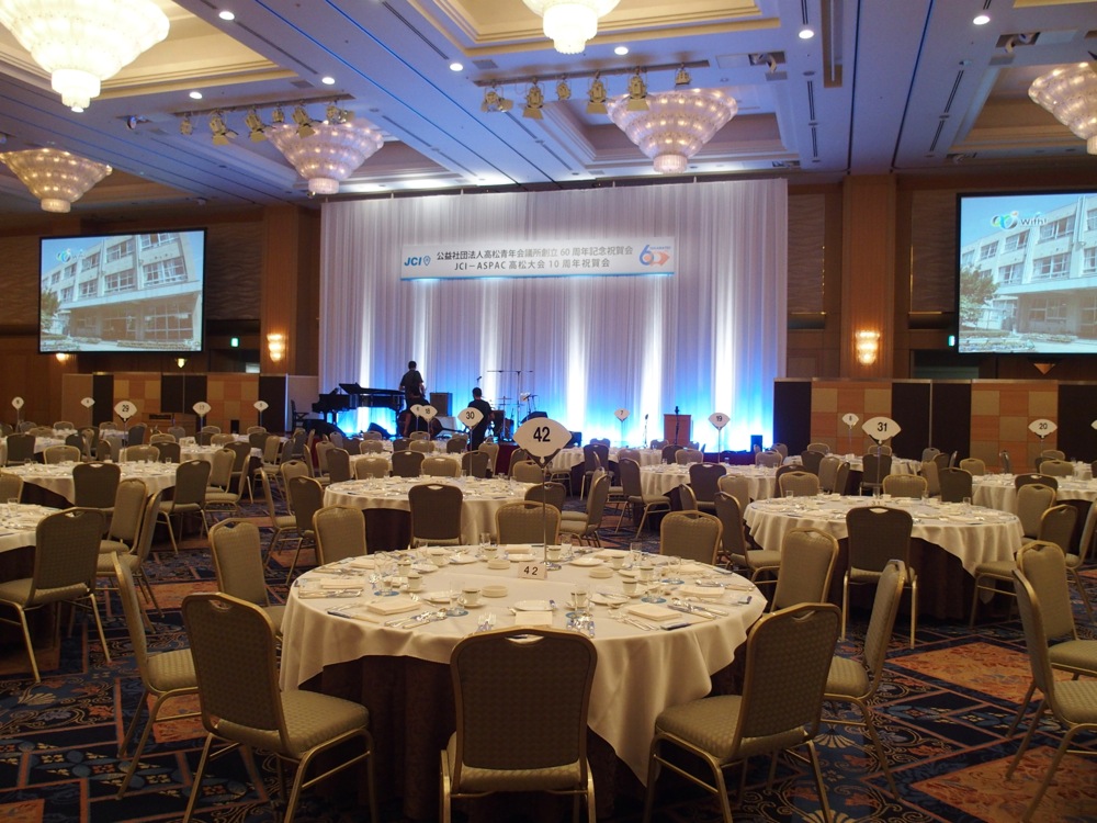 会場は高松駅前にあるJRホテルクレメント高松内のパーティー場にてで、そもそも広い空間である部屋を2つ更に繋げていて、それは膨大な空間が用意されていました。テーブルや椅子の数を見ても、相当な人数がお越しになる事は容易に想像出来ており、さぞ大きなパーティーなのだと思います。ここに呼ばれる Tsukasa さんも流石ですが、自分としても大いにサポートしていきたいところです。入念にリハーサルを行い、本番に備えました。
