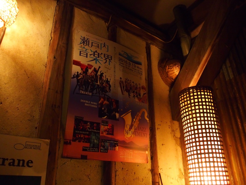 ここです。TRI4TH でも出演した事のある黒船屋です。この2日後に行わる『瀬戸内音楽界』の主催者はここのマスターでもあり、この日の内に御挨拶に伺っておきたかったのでした。そもそも前述の打ち上げが23:00頃まで続いていたのですが、黒船屋もその時間ぐらいまで、何かのパーティーが入っていたそうで、23:30ぐらいから来て貰えたら嬉しいとの事だったので、お互いの状況が一致したという事でしょう。DJの RICA'X さんとも再開でき、レコードをかけながら音楽談義が続いていったのでした。勿論、お店には『瀬戸内音楽界』のポスターも発見。これからやって来るイベントに、話しもお酒も弾みます。実はこの時は台風が近付いていて、もしかしたら19日に直撃?…ぐらいの感じではありました。しかし、マスターも交えてのこの会話は既にお酒もだいぶ入っていたので、たぶん来るのは遅れるだろう、大丈夫!…なんて気楽に話しながら、更にお酒も進ませます。…そんな時に時計を見ると、いつの間にか深夜の3:30になっているではありませんか(笑)!!…自分は明日の朝イチの飛行機で東京で戻らなければならず、また2日後(厳密には36時間後ぐらい)に足を運ぶ事になる黒船屋を後にしたのでした。次の日が起きれるのか…心配です(笑)。
