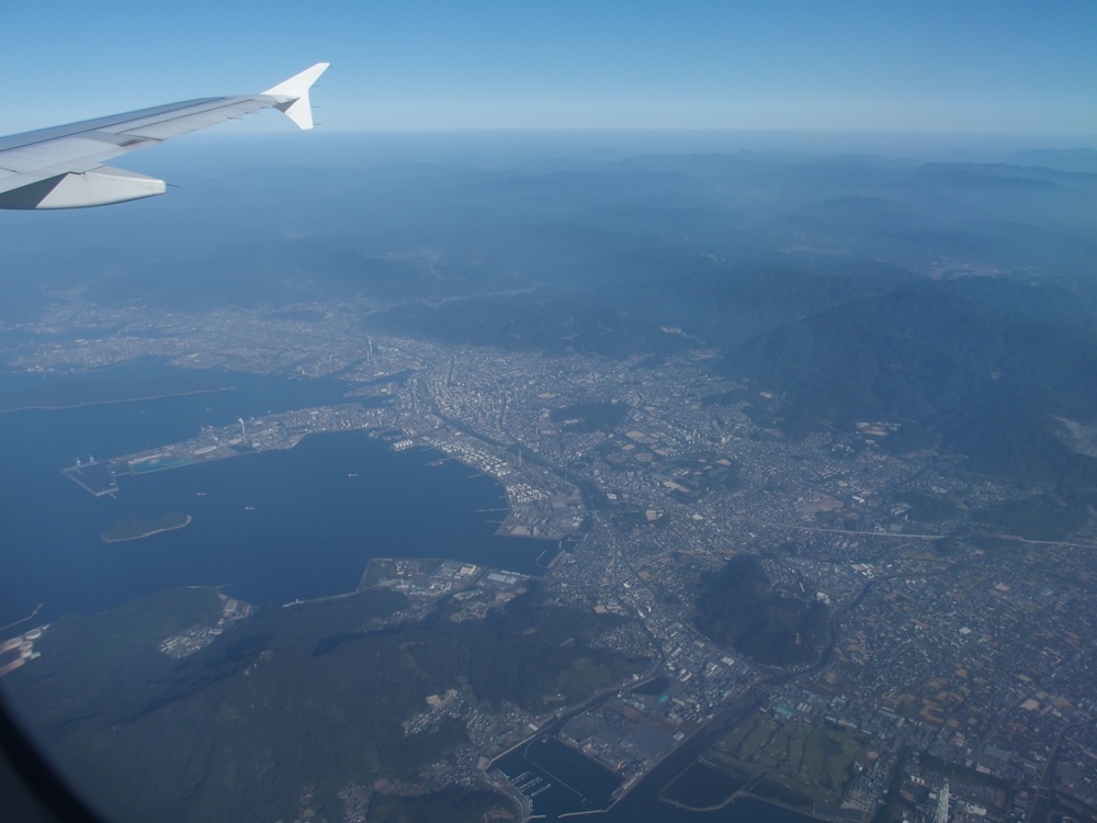 名古屋圏を北側から眺め(左上写真参照)、広島市も北側から眺め(右上写真参照)、なかなか楽しい景色です。飛行機で見るとあっという間の景色ですが、これらの場所は車移動としても何度も訪れているので、それらの移動時間とを換算させながら、今これだけ自分は速く移動している…という感覚を身体に叩き込ませておきます。そうする事で、飛行機で移動出来る有り難みをより深く感じる事が出来るのです。