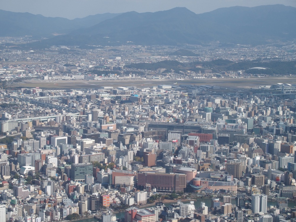その後、窓の左奥に博多駅越しに、これから着陸する福岡空港が見えてくると、いよいよ着陸態勢に入ります(右上写真参照)。このパターンは福岡空港が北風時の時に運用させる経路で、福岡の市街地をぐるっと旋回しながら着陸していきます。街に近いのが福岡空港の強みで、それが如実に分かるルートとでも言いましょうか…。こうして福岡空港に無事到着し、福岡ライブのモードへと入っていくわけです。