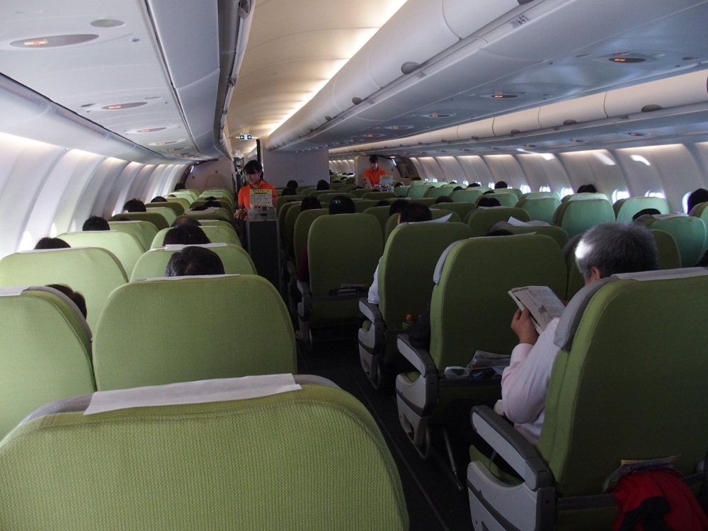 そして、搭乗、離陸です。機材はボーイング737−800型が使われていました。本国の春秋航空の機材はエアバス機らしいですが、日本はボーイング機を使用する会社が多いので、整備等の面も考慮して、新しくボーイング機の導入を図ったとの事。まだ2路線で、1日1、2往復しか飛んでいない航空会社なのですが、この努力には頭が下がります。