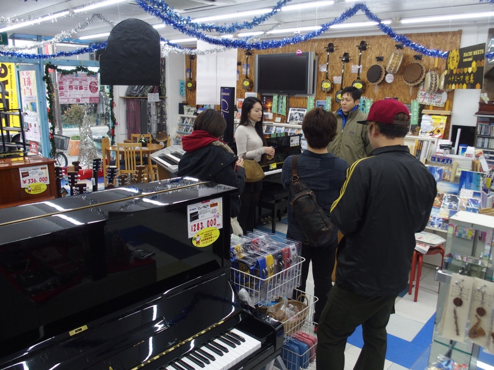 この事は、後から集合したメンバーにもすぐに伝えられ、関谷君は早速、奄美のコンビニであるワンツースリーマートにて追加の新聞を購入していたのでした。そして、この後には名瀬にある楽器屋、セントラル楽器にも御挨拶。お店の入口には、今日行うライブの事が手書きで宣伝されていて(左下写真参照)、とても味わい深かったです。