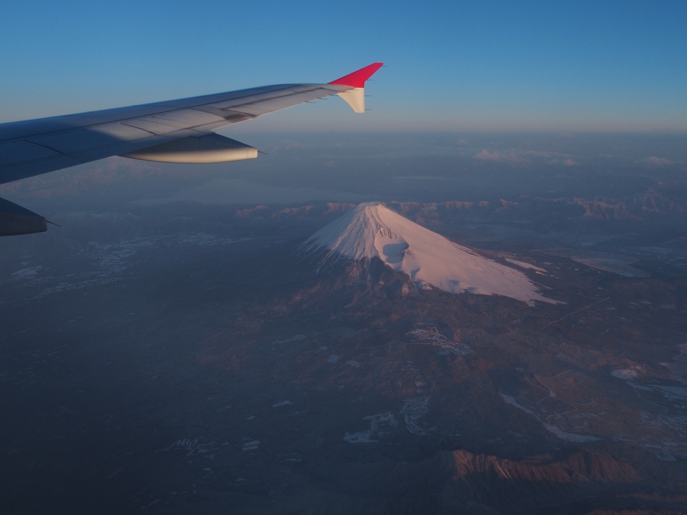 羽田空港からの離陸なので、出発してからは日本の国内線を飛んでいるかのようです。お馴染みの風景が続くとなると、やはり富士山は期待せざるを得ませんが、この時自分は右の窓側席に座っていて、素晴らしく美しい早朝の富士山を拝む事が出来ました。丁度、日の出の時刻とも重なっていた事もあって、よく済んだ空の下には、太陽に照らされて少し赤色に見えたのが印象的でした。恐らく自分の人生の中で、今までで一番綺麗に見えた富士山かもしれません。香港行きの飛行機から見えたというのが何だか愉快ですが(この時の機内は、それは活気に満ちておりました…笑)、バタバタの中で出発をしていった自分にとって、少し元気を貰えたような時間でもありました。
