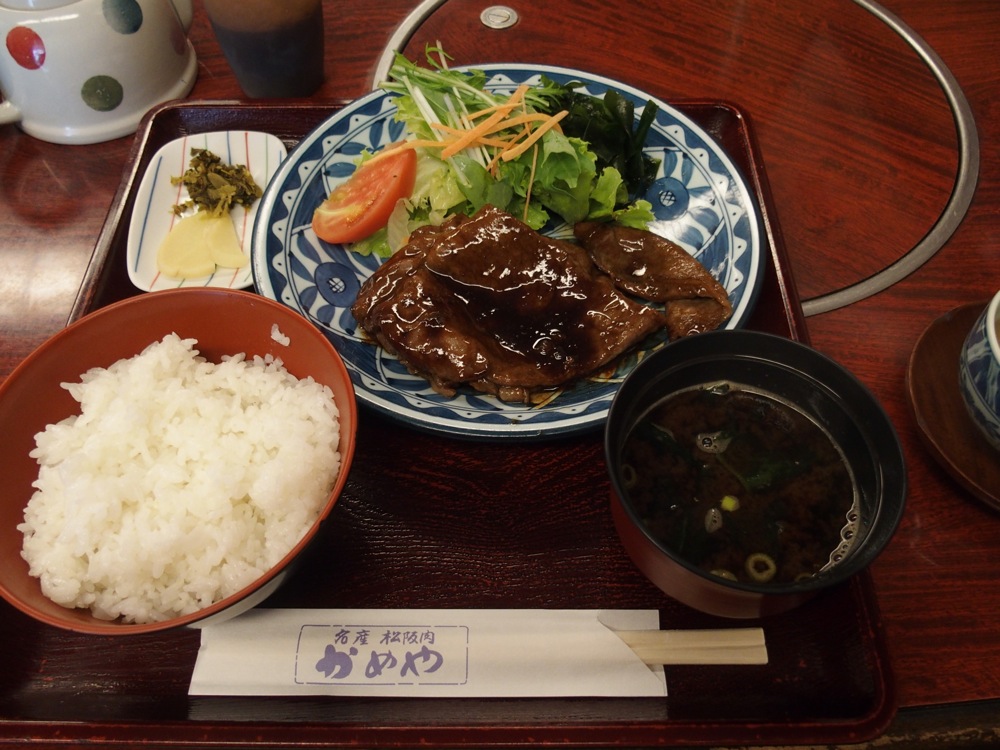 この近鉄線では、特急列車ならばダイレクトに、急行列車でも1回乗り換えるだけで大阪に向かえてしまうのですが、まだ早過ぎるな…と思った自分の目に飛び込んできたのが、松坂駅行きの列車でした(左上写真参照)。瞬間的に、松坂牛をお昼に食べたくなってしまったのですから仕方ありません(笑)。気付いたら既にその列車に乗り、お昼は松坂にて、松坂牛を味あわせて頂いたのでした。幸せでございました…。