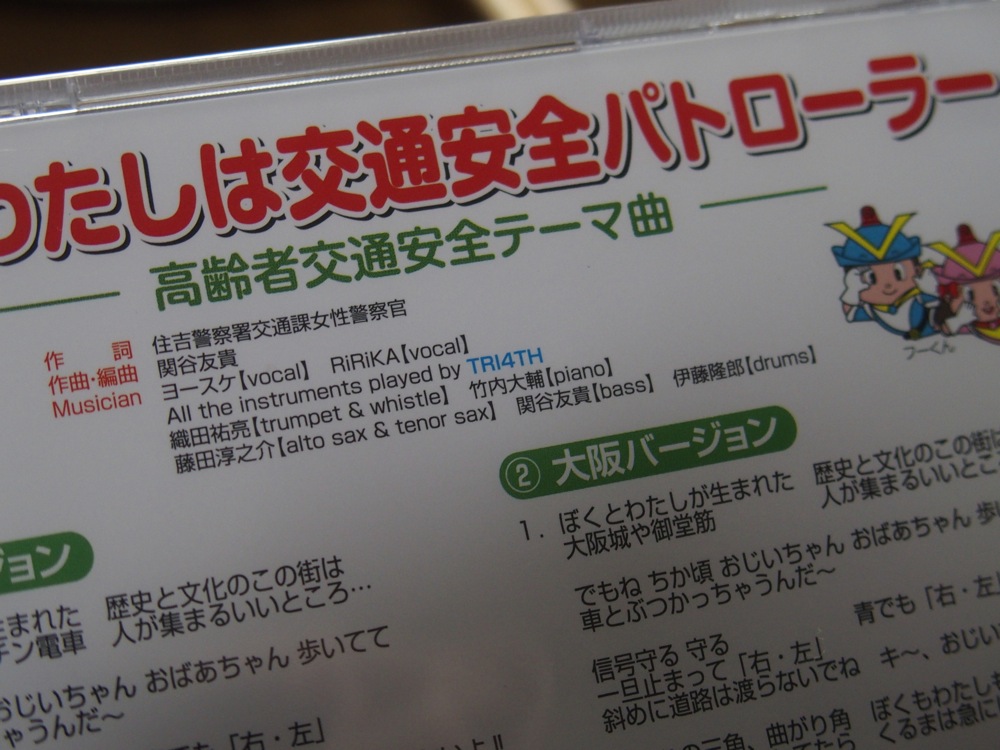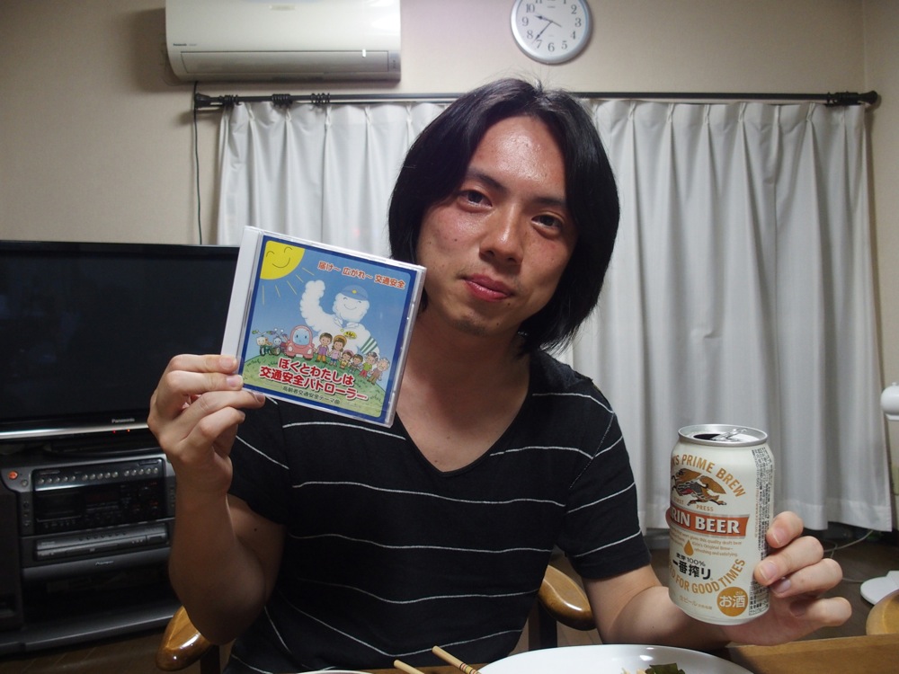 御実家では、関谷君の御両親とお婆さんに温かく迎えて頂きました。食べ物や飲み物を御馳走になり、後はひたすら他メンバーの到着を待つばかりです。そしてこの時に渡されたのが、今回の警察署イベントで使われる高齢者交通安全テーマ曲『ぼくとわたしは交通安全パトローラー』の完成CD!…実は、この曲の作曲を関谷君、演奏を TRI4TH メンバーが担当しているのです。長い移動を経て、自分達で作り上げた音源に出会えた瞬間を楽しみつつ、明日からの演奏に備えました。ちなみに TRI4TH メンバーの到着は当初より遅れが生じていたようで、既に自分は床に就いた後でした(笑)。