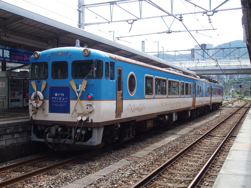 そうして2両編成の気動車がやってきます。写真を見てお分かりのように、特別にアレンジされた車両であり、正に『瀬戸内マリンビュー』号の為に改造された車両でもあります。外見は勿論の事、車内も特別仕様となっていて、自由席(左下写真参照)も設定されていますが、指定席(右下写真参照)の方がより改造度が高いとでも言いましょうか。こちらは海側の椅子が豪華になっていたり、海側に向かって座席が配置されていたりして、乗っていてなかなか楽しい感じになっていました。