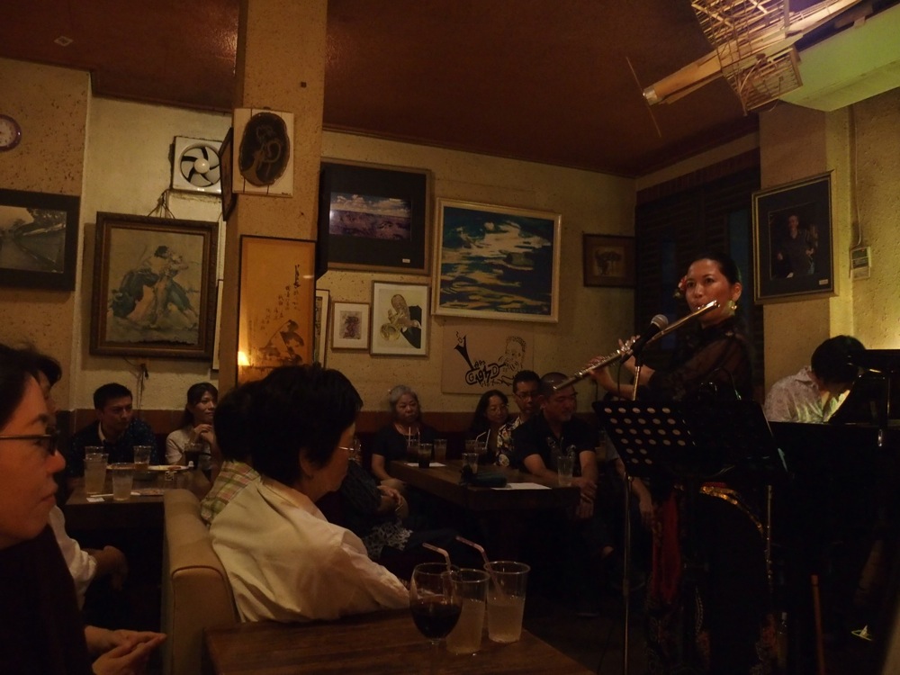 この日に『LEQUIO HISTORIA』は一般先行発売という形をとったので、今回演奏する曲の殆どは新曲という印象を持たせ、今までの曲でも新たなアレンジを加えつつ演奏していったので、お馴染みのお客さんでも、だいぶ新鮮味のある耳で聴く事が出来たのではないでしょうか。これは自分達も同じ事で、せっかくのデュオ編成で、CD制作時から協力して音楽を作っていった部分もあったので、新たな世界観を提示していくという試みは大きかったと思います。ポイントはフルートとピアノで、1対1の関係性にしていきたいという事でした。通常ですと、フルートはメロディ、ピアノは伴奏者という位置付けがなされるので、どうしてもメイン演奏者はフルートという見え方になると思うのですが、今回はアレンジの時点から、お互いが寄り添って曲を構成させる手法をとっていきました。ピアノがメロディをとる部分もありますし、フルートとハモらせる部分もあります。伴奏にしても決まり事を多くして、ただの即興演奏では無い事も表現していきます。…言わば、作品の方向性がより明確になってきたのかもしれないですね。ジャズ的なアプローチも勿論取り入れますが、根本的には沖縄の音楽を、より多くの人と共有していきたいという、強い気持ちの表れが大きくなっているのかもしれません。そして今回のライブも、その想いを皆さんと分かち合わせるべく、やっていきました。そんな中での満員御礼という状態…。こんなに嬉しい状況が他にありましょうか…。
