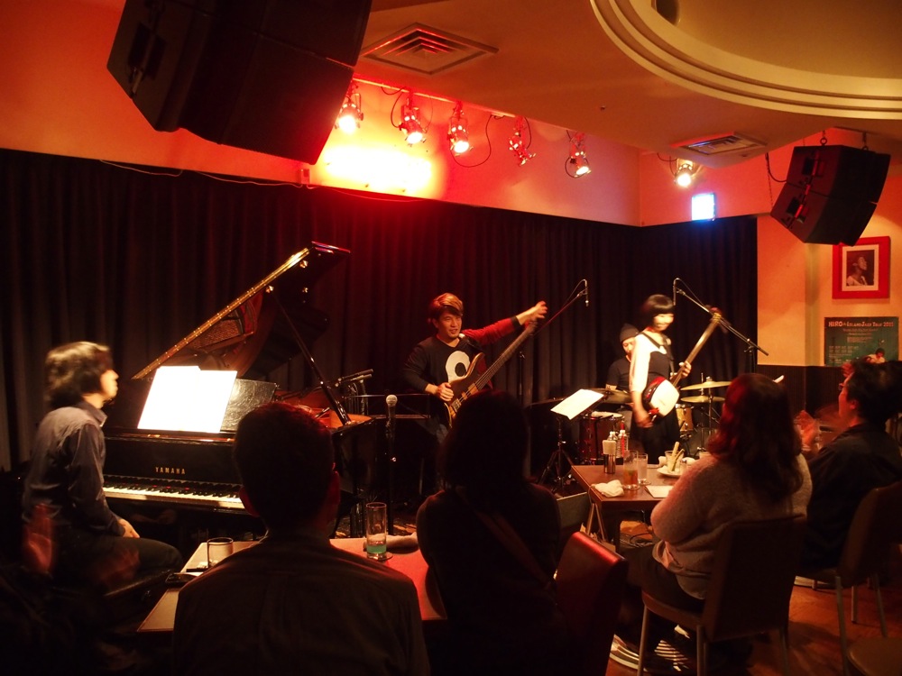 早速CDも置かせて頂き(自分のピアノトリオ『Voyaging』も♪)、準備万端。そして少しお店を後にしてから、また戻ってきた際には、後ろまで立ち見が出る程のお客さんで溢れかえっていました。いつの間に!?…という感じではありましたが、それほど多くの方に注目されていた1日でもあったのでしょう。嬉しいと同時に、気合いも入る瞬間ではありました。いよいよ本番が始まります。