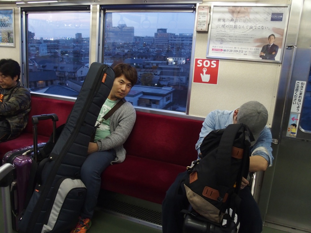 車内では既に祝杯が行われ(笑)、楽しい感じが伝わってくると思いますが、メンバーそれぞれの荷物は多く、自分もキーボードを持っての移動だったので(左下写真参照)、その大変さの反動のものなのかもしれません(笑)。これらはインストアライブ用に用意したものでもありましたが、周平さんはパーカッションのセットもあるので、この3人だけでも、荷物の量はかなりのものになってしまいます。新幹線座席は広めに設定してあるのでまだ良いのですが、それ以外の移動がこれまた大変です。車内では出来るだけ楽しんで移動しておきたいものなのでした。