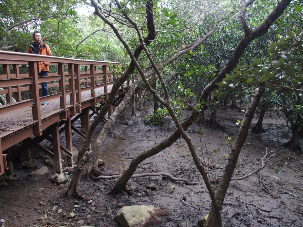 昼食後、どこか奄美を観光するに相応しい所を模索していたところ、名瀬から車で20分ぐらい走らせたところに、有名なマングローブ原生林があるらしく、ここに向かう事にしました。すぐに名瀬の市街地からは離れ、山と海が混在するような景色になりますが、これがいわゆる奄美らしい景色でもあり、アンナさんの住む所や、先程の名瀬は例外のような感じなのだとか…。そうして着いた所は、黒潮の森マングローグパークという場所。特別保護区に指定されており、公園風に中を見学する事も出来ました。