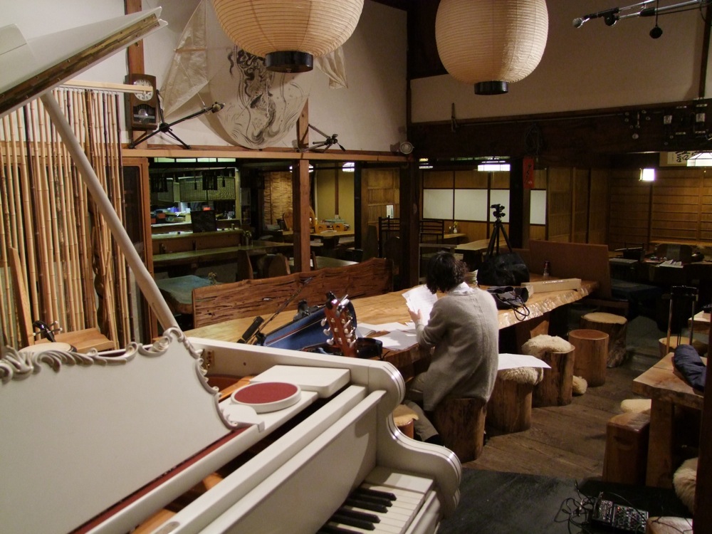 この日は、岐阜駅の北側、長良川にも程近い布武(fubu)というお店にて演奏が行われる予定になっていました。木の造りを基本とする重厚な建物で、和食屋さんらしいのですが、1段高い位置に立派なステージが存在し、その上には真っ白のベーゼンドルファー・ピアノが光ります。よく見ると細かい彫刻が成されており、世界的に見ても珍しい型になるのだとか…。不思議とこの空間によく似合っているようにも見え、何とも言えない魅力が放たれておりました。そうして Tsumuzi 君や野々村君と合流し、軽いリハーサル…、その後、本番までの短い時間をゆっくりと過ごしました。そう言えば東京からここ岐阜まで、それは6時間半もの長い道のりでもあったのでした。