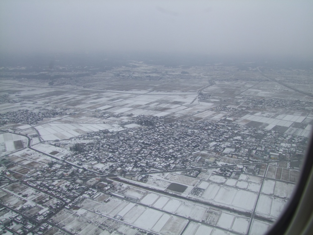 こういった景色に見惚れていると、もう飛行機は高度を下げ始めています。本当に北陸という地は近いのです。少し雲の中を飛行していたりもしましたが、景色がはっきりしてくると、そこはもう完璧に雪景色という中、小松空港に着陸を果たしました(小松空港付近にはそんなに雪はありませんでしたが)。素晴らしい景色にパワーを貰い、まずは現地へと直行します!