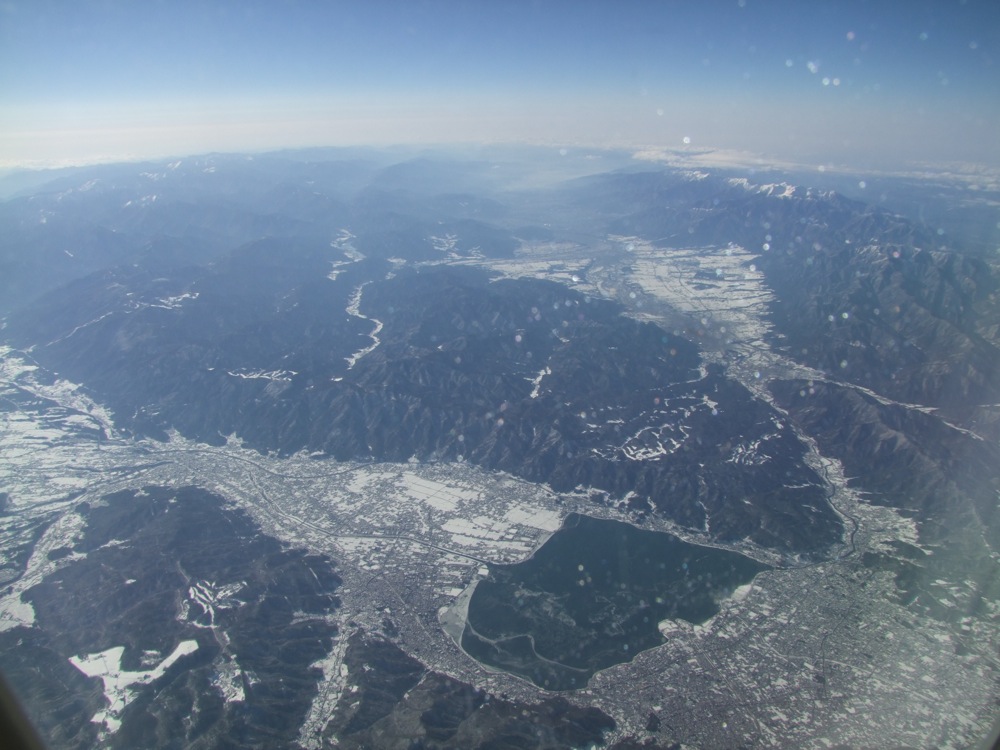 そして早速、離陸中に富士山が見えてきます。羽田を出発後、飛行機は北西に進路を進めている感じなるので、埼玉県と東京都の県境付近に沿って飛んでいる…というようなルートになるのでしょうか。狭山湖、横田基地を手前に見ながら富士山…という、自分にとっては珍しい組み合わせの景色(左上写真参照)を見る事が出来ました。その後は山梨県の北側から、甲府盆地越しの富士山を望め(右上写真参照)、その先は八ヶ岳と富士山(左下写真参照)、諏訪湖(右下写真参照)と続きます。飛行機のルートから南側の景色を見ているような感じになりますが、徐々に雪景色になってくる変化の多い状況も重なり、大忙しの(笑)機窓風景でもありました。