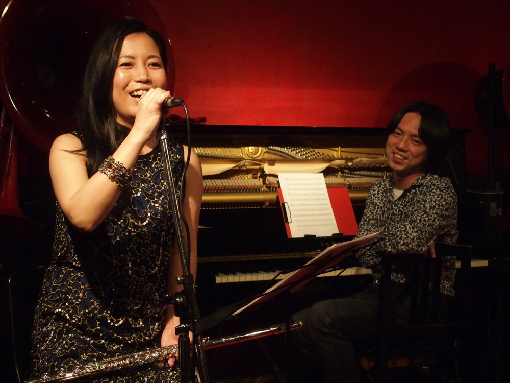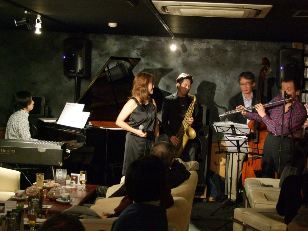 最初は、何とか本番に間に合った(笑)藤田君と自分とのデュオ演奏。その後に信平さんを加えて、3人編成としてもインスト演奏を行っていきます。基本は自分はピアノですが、お店の方の御好意でローズピアノを出し下さり、それを使っても演奏してみました(信平さんもフルート以外にシェイカー等を使ったりして、サウンドのバリエーションを増やしていきます)。この後に Mamiko さんと Mirano さんを呼んで、歌入りの曲をお届けしていきますが、基本はどちらか1人がステージに立ち、何曲かやるという構成にしていきました。勿論、やる曲は事前に決めていましたが、その時に誰がソロを取って、どの楽器を使って…というのは、わりとその場で決めていたような気がします(リハーサルとも異なった事をやっていたと思います)。流石はジャズらしい空間で、信平さんが積極的に率いて下さっていた部分もあり、緊張感もありつつ、楽しく音楽に向き合えたような気がします。