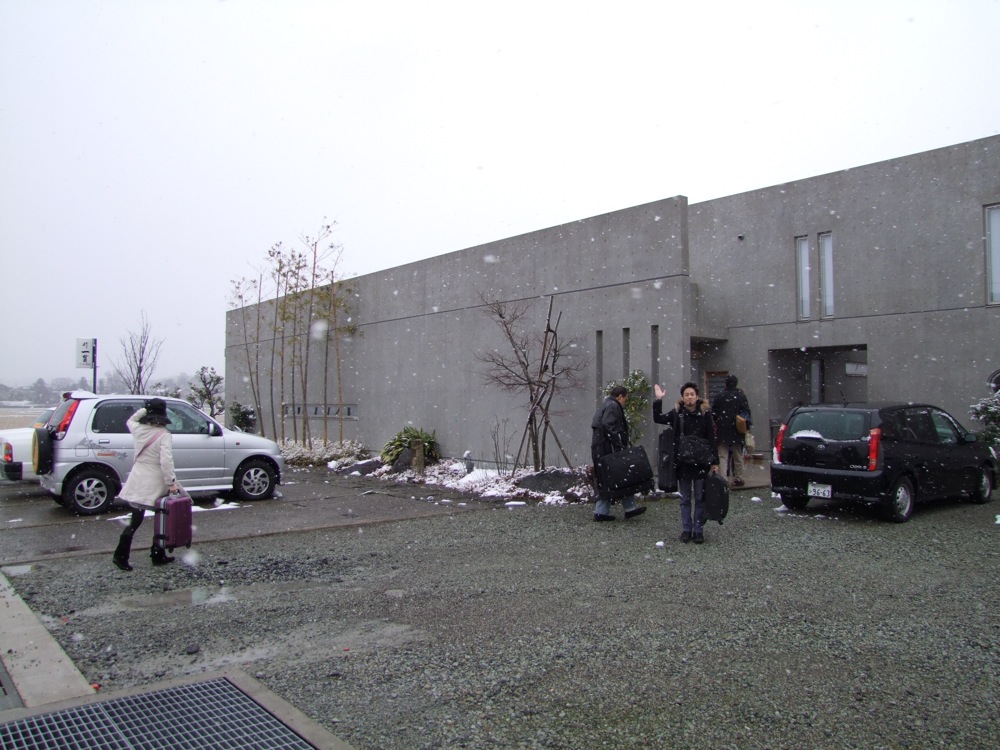 ぐっすりと眠れた次の日は、もう自分達は東京に戻るだけとなってしまいました(信平さんは東京に戻らず、このまま別の地方現場に行くとの事でした)。辺りは雪がちらついており、雪国感を思わせる風景になっていただけに、もう東京に戻るのは勿体無い感じもしましたが、せっかくメンバーも全員揃った事なので(笑)、記念写真を撮っておきましょう。ある意味で、これが唯一だったような気もします。