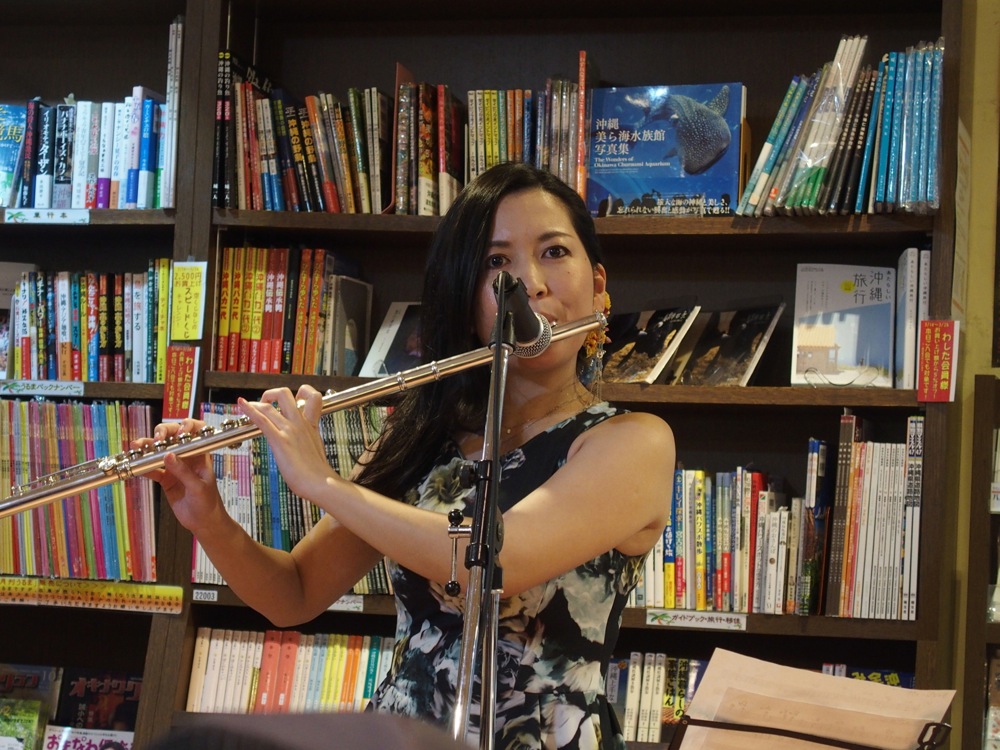 それは、西仲さんのアルト・フルートの使用です。右上写真の西仲さん自身が持っているものがそうですが、明らかに大きさが違うのが分かると思います。勿論、出てくる音は通常のものより低く、大人で落ち着いた印象を与えさせます。このフルートのライブ・デビューは沖縄での演奏が先のようでしたが、東京でのライブでは今回が初披露との事でした。まだ買って間も無いらしく、その重さに慣れるのに時間が掛かりそうでしたが(笑)、ブルースをこのフルートで吹ききり、西仲さん自身の音楽に新たな可能性を見出だせたと思います。