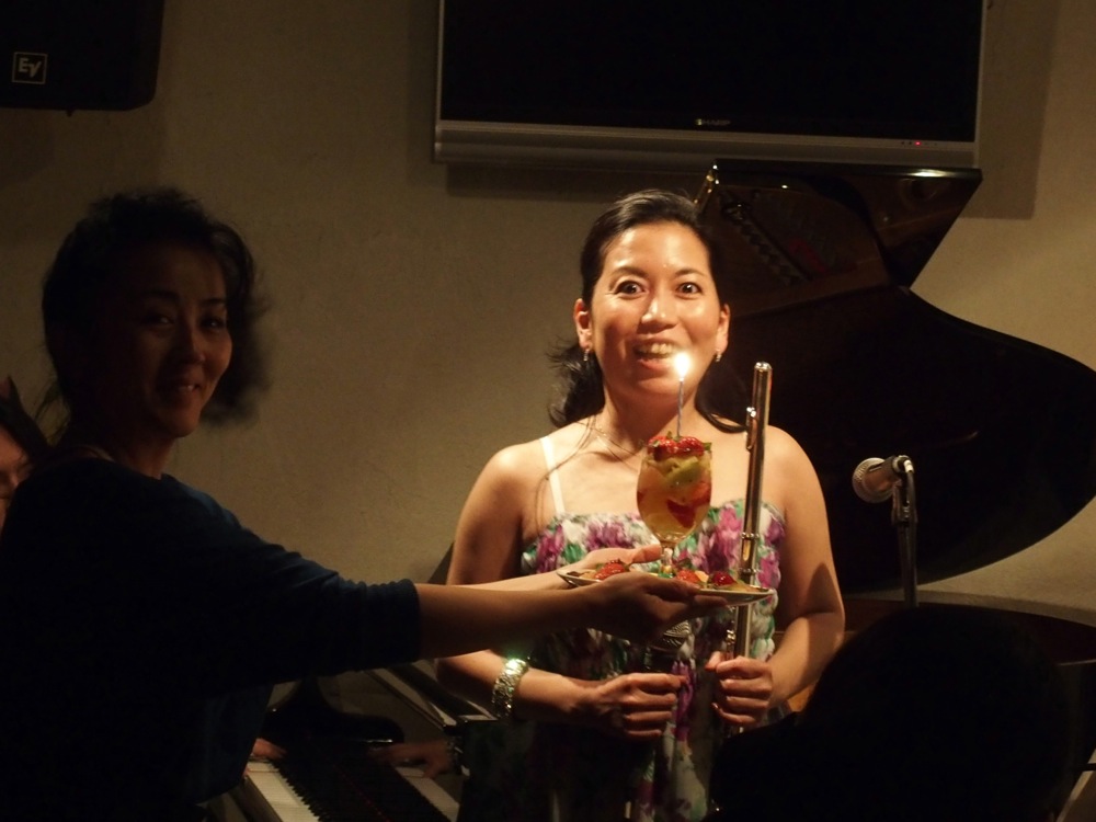 西仲さん自身の誕生日は、この日の後に行う3本目のライブの方が日にちは近いものの、既に店内はお祝いムードになっており、差し入れやバースデー・ケーキをプレゼントしてくれた方もいらっしゃいました。お店には和やかな空気が漂い、自分達も非常にリラックスして演奏させて頂いているのですが、いざ演奏に入ると真剣モードに突入します…。演奏曲も慣れているので、固くならないで良い筈なのですが、だからこそ色々な演奏アプローチを選んでいかなければなりません。特に2人だけという場ですから、尚更です。しかし、その状況をお互いに楽しんでいるとも言えましょう。ジャズ・スタンダードから沖縄民謡まで、2人で出来る可能な限りの演奏をやらせて頂きました。