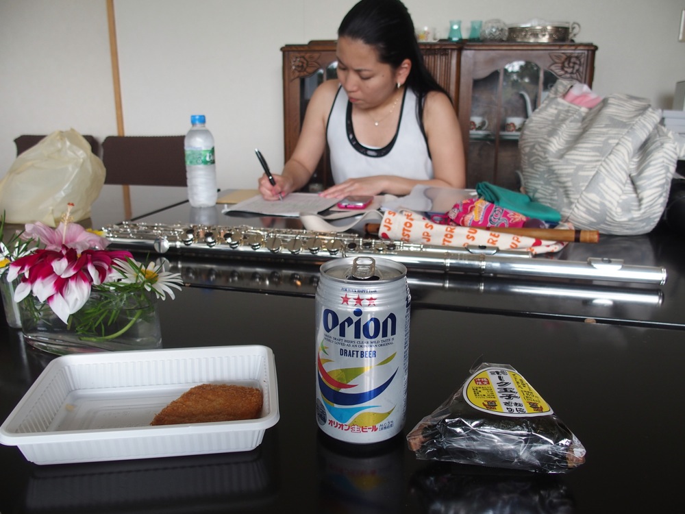 …早速、ウェルカムドリンクとウェルカムフードを頂きました(右上写真参照…笑)。途中のコンビニで購入したオリオンビールと、沖縄限定おにぎり…ではありますが、これがまた満足してしまうのですから、自分の沖縄に対する想いは本物かもしれません(笑)。沖縄にやってきたという実感も強くなり、徐々に今回のライブに対する期待感も湧き上がってきたものでした。