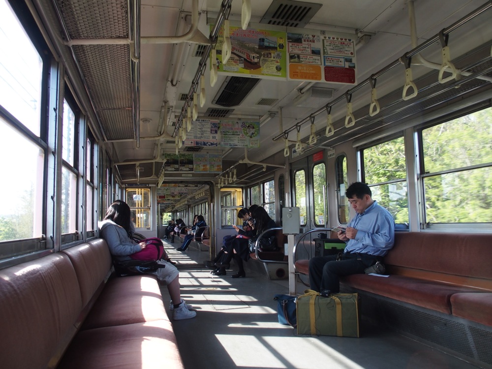 JR線を乗り継ぎ、石山駅で京阪電鉄石山坂本(いしやまさかもと)線に乗り換えます。この路線の一部区間もまだ乗った事がありませんでした。滋賀県の大津市を中心とした路線展開をしている路線で、本家の京阪電鉄とは車両の大きさもミニサイズで、京阪の路面電車バージョンのような印象を受けます。ここまでくると列車本数も多く、基本的には15分毎の運転で、区間によってはその運転本数が倍になります。