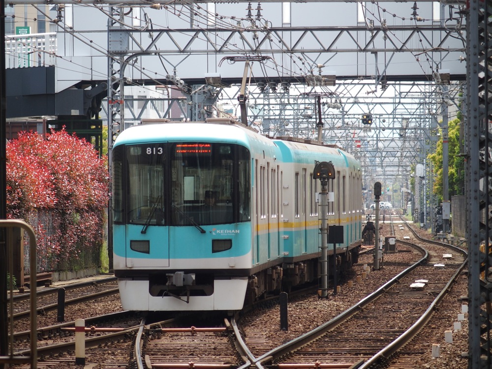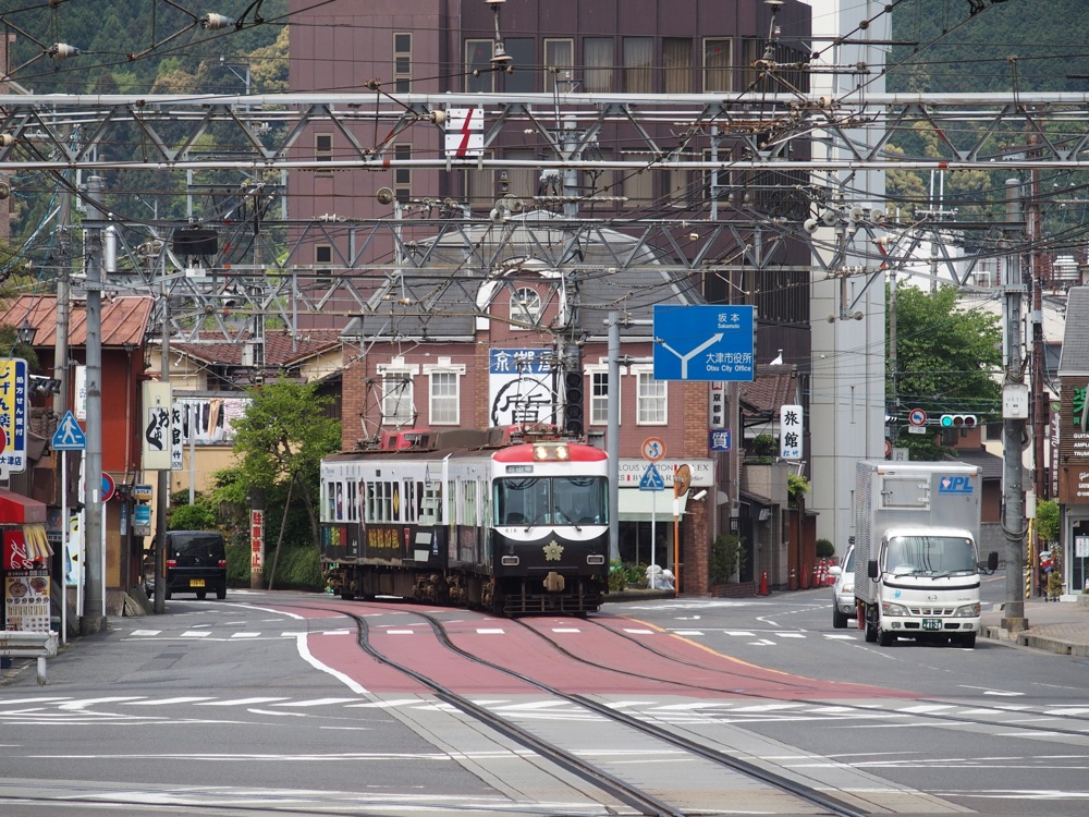 路面電車のような風情ですが、道路との併用軌道になる区間は少なく、やはり普通の鉄道路線だと思わせます。ただ、京阪京津(けいしん)線との接続駅である浜大津駅付近は、接続先の京津線を含めて併用軌道区間が続くところでもあり、京津線は特例の4両編成(左下写真参照)なので、道路を走る車との迫力ある離合シーンが毎日のように展開されている場所でもあります。今回はちょっとしか寄れませんでしたが、いつかゆっくりとその光景を眺めてたいものです。