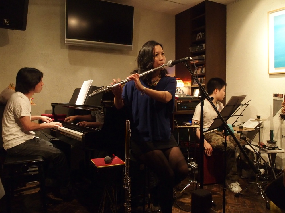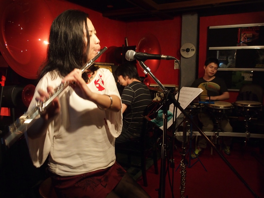 前回と同じようにアルト・フルートも駆使し、そして新しく取り上げた沖縄民謡曲も積極的に取り上げて…、ここで1つの到達点は見る事が出来たかなと思いました。また、Meg というお店の特徴として、ステージ上から目線を変えずに見える範囲全てに、お客さんが集まって見える…という点があります。その分、お客さんと一緒になって作っていけるライブというのを肌で感じる事が出来るのです。これは自分達は当然そうですが、お客さん自身も感じて頂けているのではないでしょうか。壁が真っ赤に染まっているという独特の世界観もありますが(笑)、ライブの良さを直に吸収して頂けたらと思います。