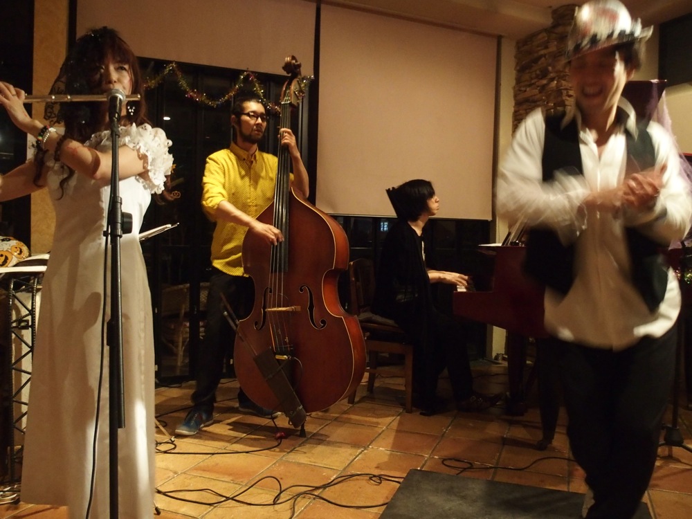 実際、今回の選曲は、ゲゲゲの鬼太郎のテーマや、マイケル・ジャクソンの“Thriller”、そしてアダムスファミリーのテーマ曲等、正にハロウィンだからこその曲を、随所に盛り込んでいったのでした。また、こうした格好で演奏する事により、更に雰囲気は倍増していったに違いありません(笑)。イタリアンレストランがハロウィン・パーティー会場へと変わった瞬間でした。