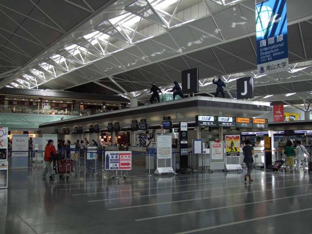 セントレアのターミナルに着くと、何故かチェックインカウンター上に忍者の姿がチラホラ見えました(左上写真参照…笑)。こっちに向けてピースサインをしており、だいぶ余裕の表情を見せていたのが印象的でしたが、こんな景色をゆっくり楽しめるのも、早くホテルを出ておいた賜物というものです。そして、先程「少し早く」…と言いましたが、何だかんだで飛行機出発の2時間前には空港に着いていた事を、ここに白状します(笑)。