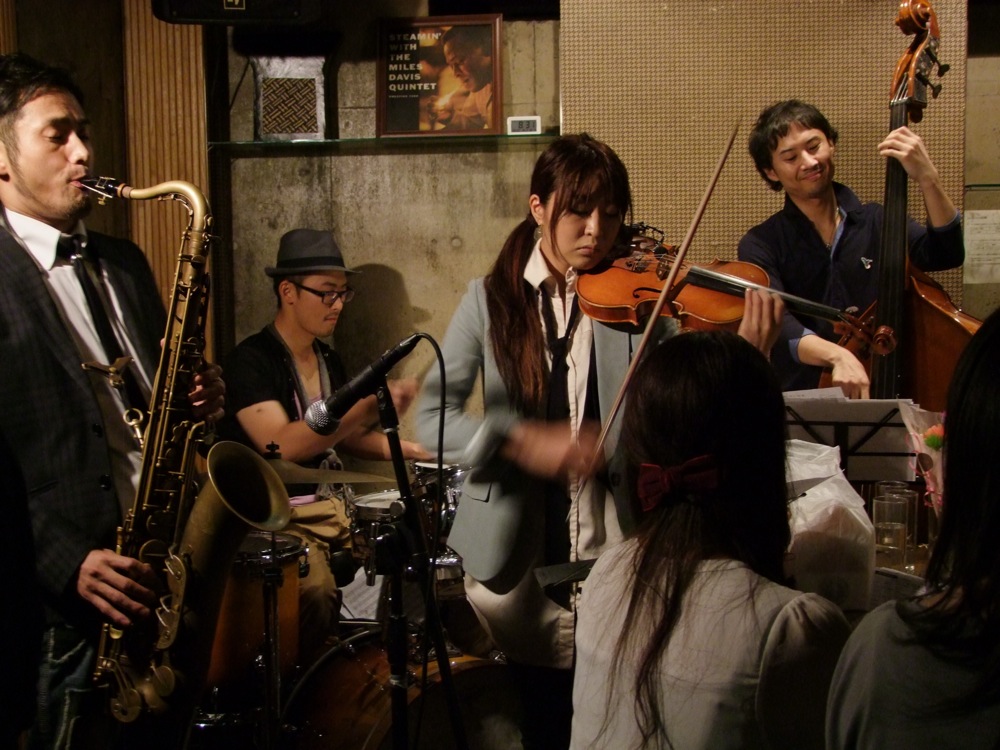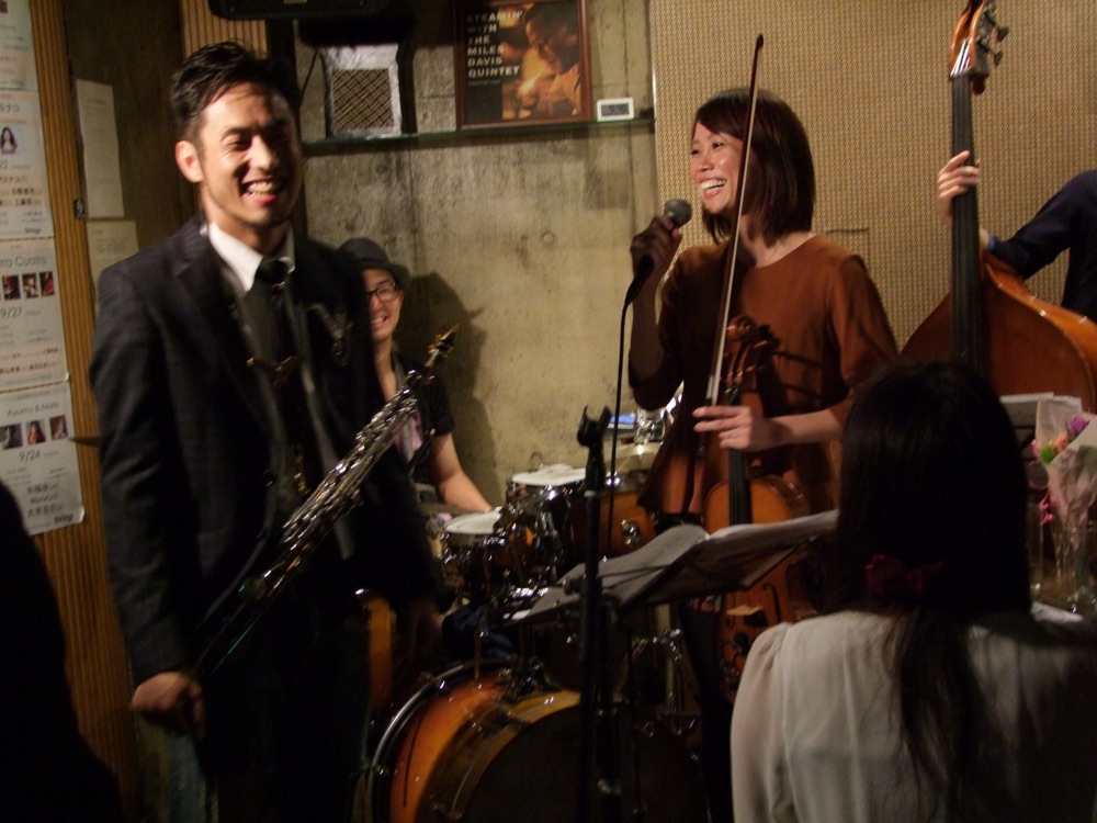 また、この日はゲストプレイヤーの方達の出演もありました。まずは、バイオリンの皆川真理奈さん(左上写真参照)。皆川さんはこの時、藤田君との共演回数が多く、皆川さん自身が所属する東京バイオリンに藤田君がゲスト出演したり、2013年の東京ジャズでは、藤田君と共にNHK番組体感ブースでの共演も果たしています。