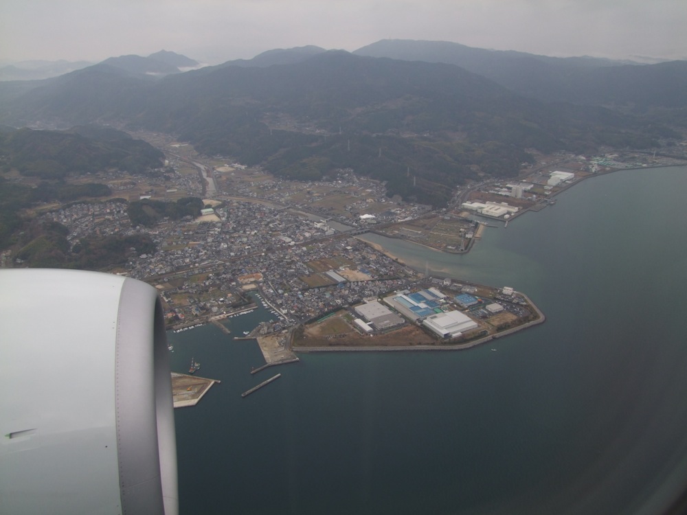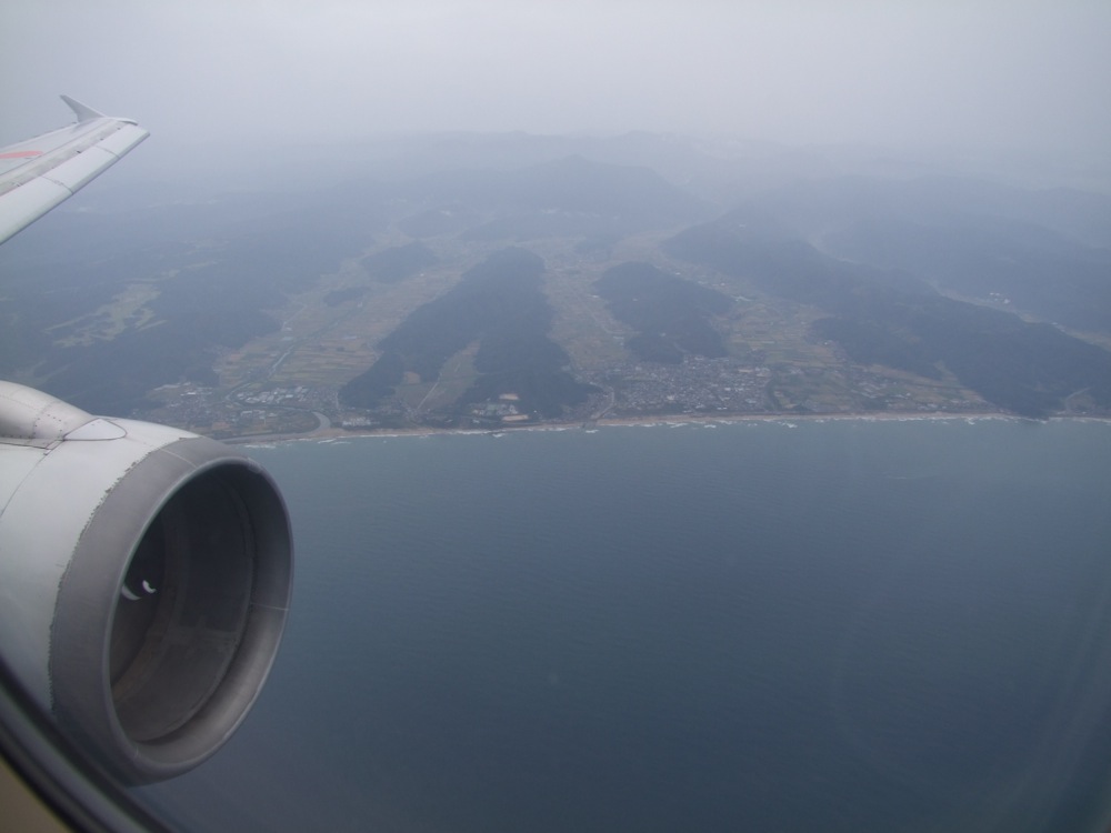 飛行機に乗ると、割りとすぐに眠ってしまった、藤田君と森田君…。しかし、自分は機窓を楽しむべく、なかなか眠る事が出来ません(笑)。この日は曇りがちの天気だったので、離陸後の景色はあまり楽しむ事が出来なかったのですが、勝負?は鳥取空港に向けて降下を開始し始める頃です…。雲も少し切れ目が見え始め、着陸10分程前になると、眼下に鳥取の市街地が見えてきました(左下写真参照)。そして、いったん空港上空をやり過ごし、Uターンしてきて無事に鳥取空港に着陸です。なかなか良い景色でした。