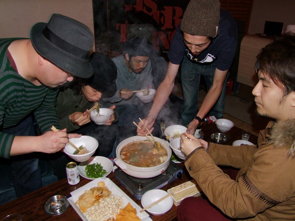 ライブが終了した時点で、時刻はまだ21:30。皆、遠方から来ている方もいるので、そんな時間かなと思いましたが、このままライブハウスのロビーを打ち上げ会場にして、お客さんも交えて飲み会が決行されました!…外は寒いですが、店内は鍋を突きつつ、とても温かい雰囲気に包まれました。このお店の常連のお客さんとも色々お話しをさせて頂き、ここのイベントは間違い無い事、色々なバンドが来るのが楽しみな事、もっと伊那を熱い場所にしていきたい事…等々、とても興味深い時間を過ごさせて頂きました。